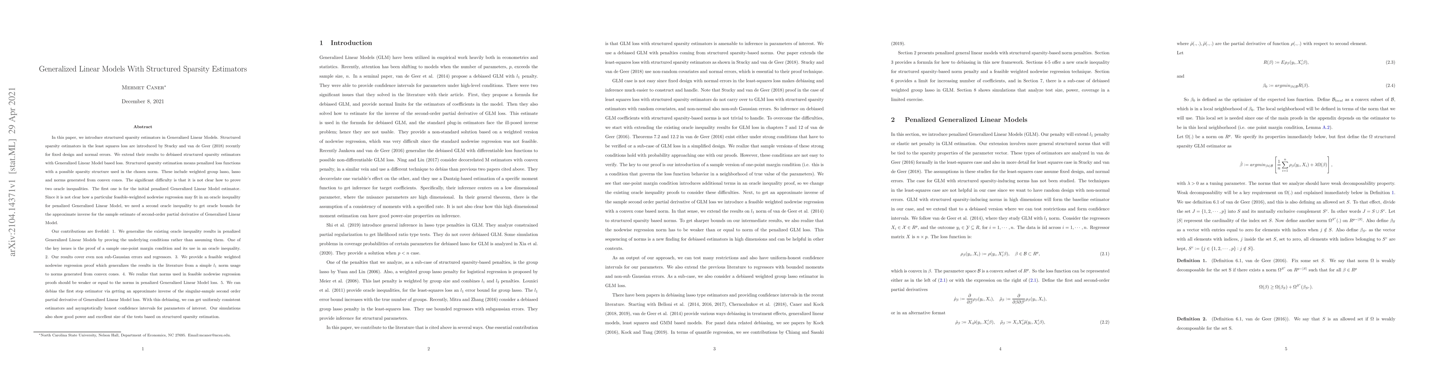 This paper extends structured sparsity estimators to Generalized Linear Models, proving oracle inequalities for both initial penalized estimators and their debiased versions. Key contributions include generalizing existing oracle inequality results, accommodating non sub-Gaussian errors, and providing a feasible weighted nodewise regression approach for norms derived from convex cones.