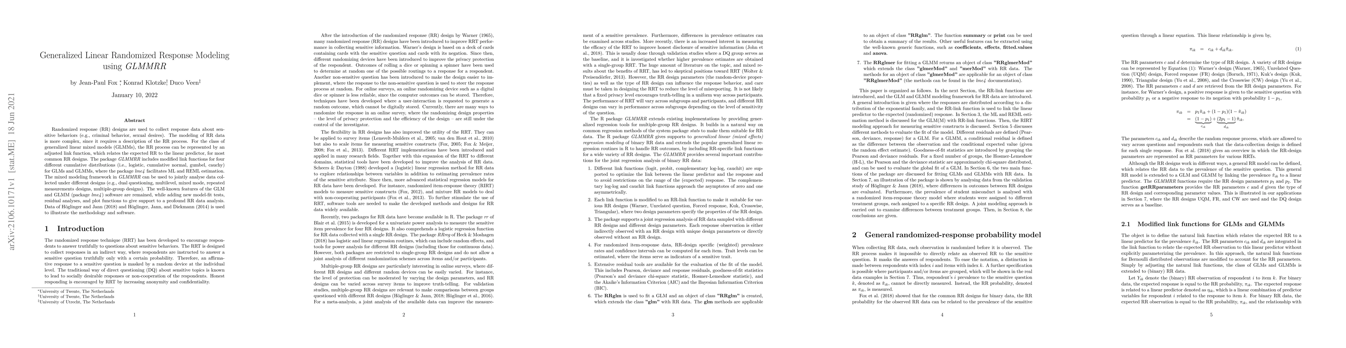 The paper introduces GLMMRR, a package for modeling randomized response data using generalized linear mixed models, which includes modified link functions for various cumulative distributions. It facilitates the analysis of sensitive behavior data through mixed modeling frameworks, offering enhanced model-fit tests and residual analysis.