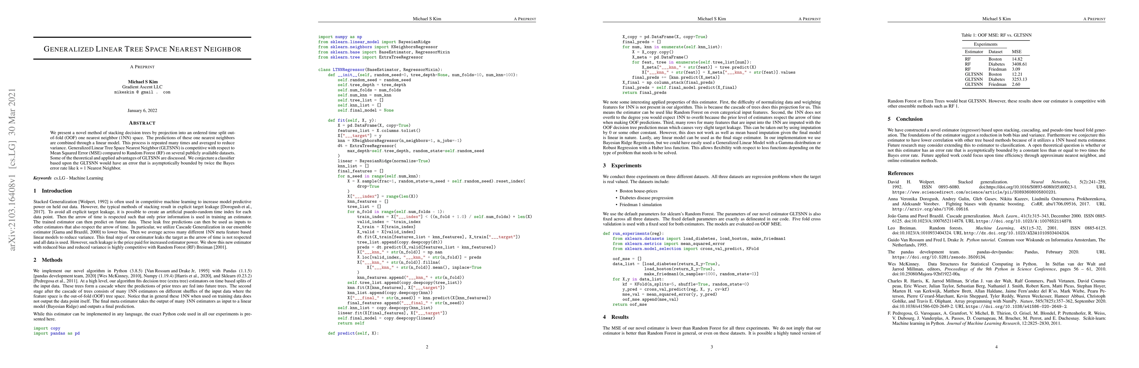 The paper introduces Generalized Linear Tree Space Nearest Neighbor (GLTSNN), a method that stacks decision trees by projecting them into an ordered time split out-of-fold one nearest neighbor space, combining predictions via a linear model, and averaging results to reduce variance. GLTSNN shows competitive performance in terms of Mean Squared Error compared to Random Forest on various datasets.