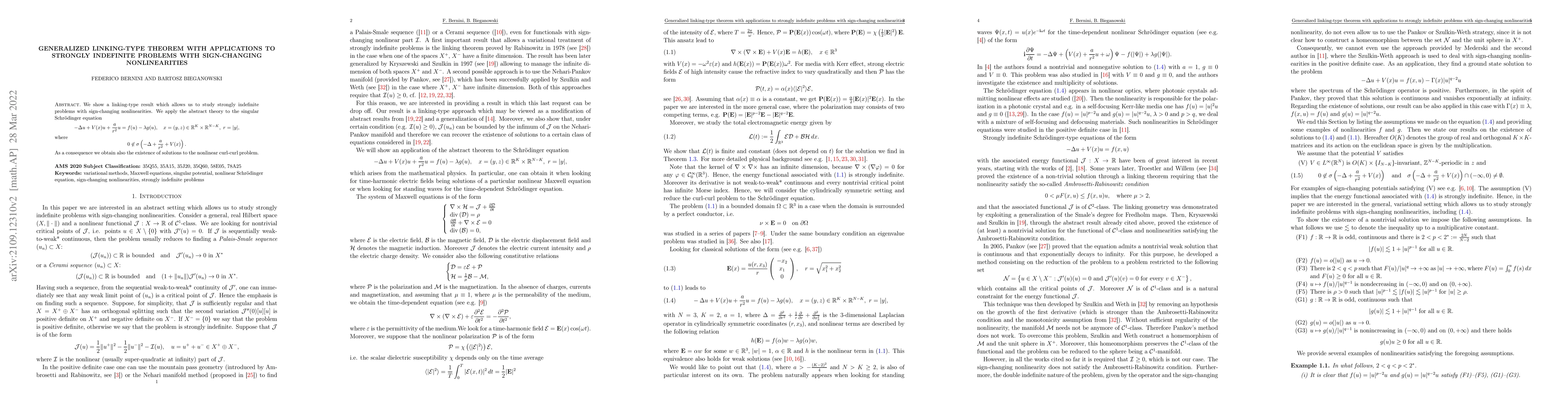 This paper presents a generalized linking-type theorem for strongly indefinite problems with sign-changing nonlinearities, applying it to the singular Schrödinger equation and proving the existence of solutions to the nonlinear curl-curl problem.