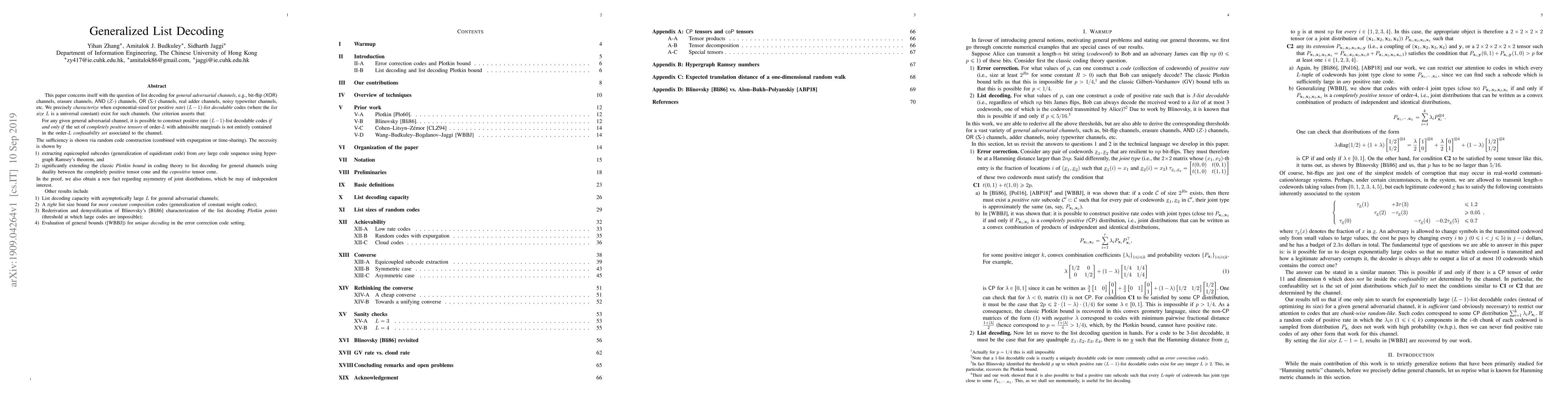 This paper concerns itself with the question of list decoding for general adversarial channels, e.g., bit-flip ($\textsf{XOR}$) channels, erasure channels, $\textsf{AND}$ ($Z$-) channels, $\textsf{OR}$ channels, real adder channels, noisy typewriter channels, etc. We precisely characterize when exponential-sized (or positive rate) $(L-1)$-list decodable codes (where the list size $L$ is a universal constant) exist for such channels. Our criterion asserts that: "For any given general adversarial channel, it is possible to construct positive rate $(L-1)$-list decodable codes if and only if the set of completely positive tensors of order-$L$ with admissible marginals is not entirely contained in the order-$L$ confusability set associated to the channel." The sufficiency is shown via random code construction (combined with expurgation or time-sharing). The necessity is shown by 1. extracting equicoupled subcodes (generalization of equidistant code) from any large code sequence using hypergraph Ramsey's theorem, and 2. significantly extending the classic Plotkin bound in coding theory to list decoding for general channels using duality between the completely positive tensor cone and the copositive tensor cone. In the proof, we also obtain a new fact regarding asymmetry of joint distributions, which be may of independent interest. Other results include 1. List decoding capacity with asymptotically large $L$ for general adversarial channels; 2. A tight list size bound for most constant composition codes (generalization of constant weight codes); 3. Rederivation and demystification of Blinovsky's [Bli86] characterization of the list decoding Plotkin points (threshold at which large codes are impossible); 4. Evaluation of general bounds ([WBBJ]) for unique decoding in the error correction code setting.