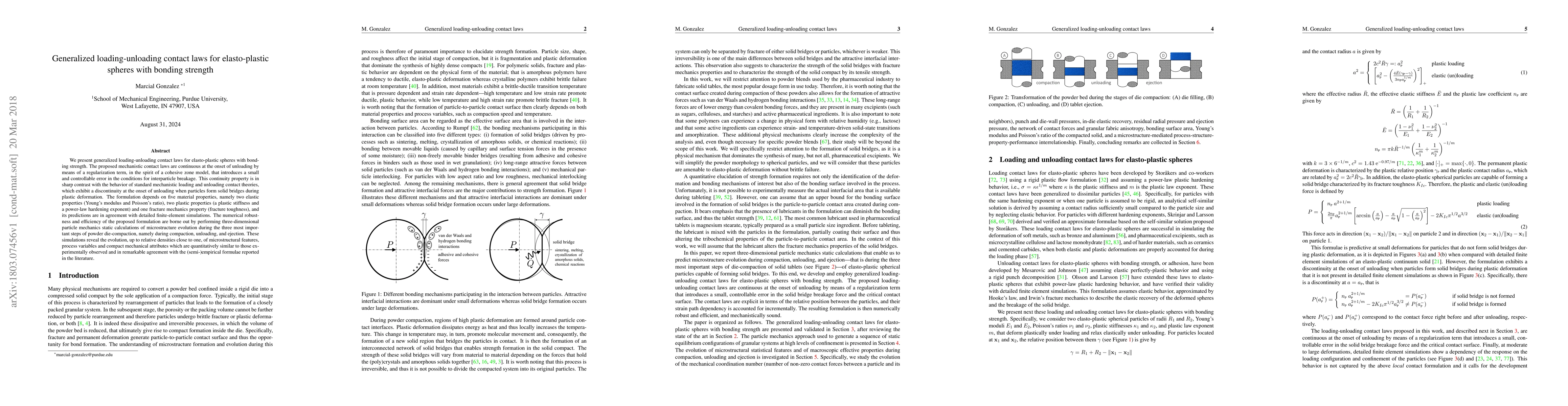 We present generalized loading-unloading contact laws for elasto-plastic spheres with bonding strength. The proposed mechanistic contact laws are continuous at the onset of unloading by means of a regularization term, in the spirit of a cohesive zone model, that introduces a small and controllable error in the conditions for interparticle breakage. This continuity property is in sharp contrast with the behavior of standard mechanistic loading and unloading contact theories, which exhibit a discontinuity at the onset of unloading when particles form solid bridges during plastic deformation. The formulation depends on five material properties, namely two elastic properties (Young's modulus and Poisson's ratio), two plastic properties (a plastic stiffness and a power-law hardening exponent) and one fracture mechanics property (fracture toughness), and its predictions are in agreement with detailed finite-element simulations. The numerical robustness and efficiency of the proposed formulation are borne out by performing three-dimensional particle mechanics static calculations of microstructure evolution during the three most important steps of powder die-compaction, namely during compaction, unloading, and ejection. These simulations reveal the evolution, up to relative densities close to one, of microstructural features, process variables and compact mechanical attributes which are quantitatively similar to those experimentally observed and in remarkable agreement with the (semi-)empirical formulae reported in the literature.