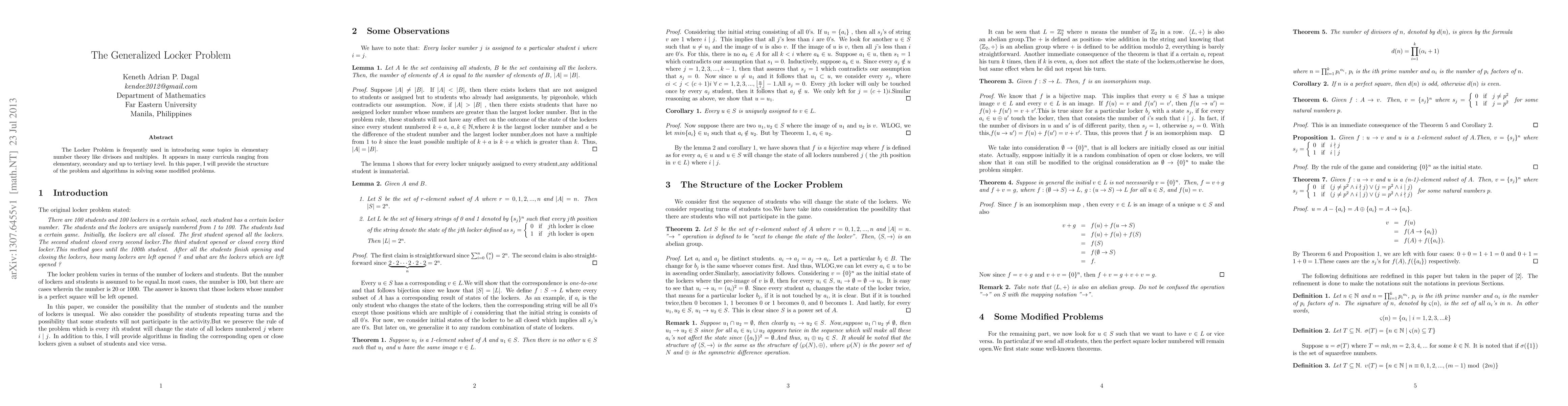 The Locker Problem is frequently used in introducing some topics in elementary number theory like divisors and multiples. It appears in many curricula ranging from elementary, secondary and up to tertiary level. In this paper, I will provide the structure of the problem and algorithms in solving some modified problems.