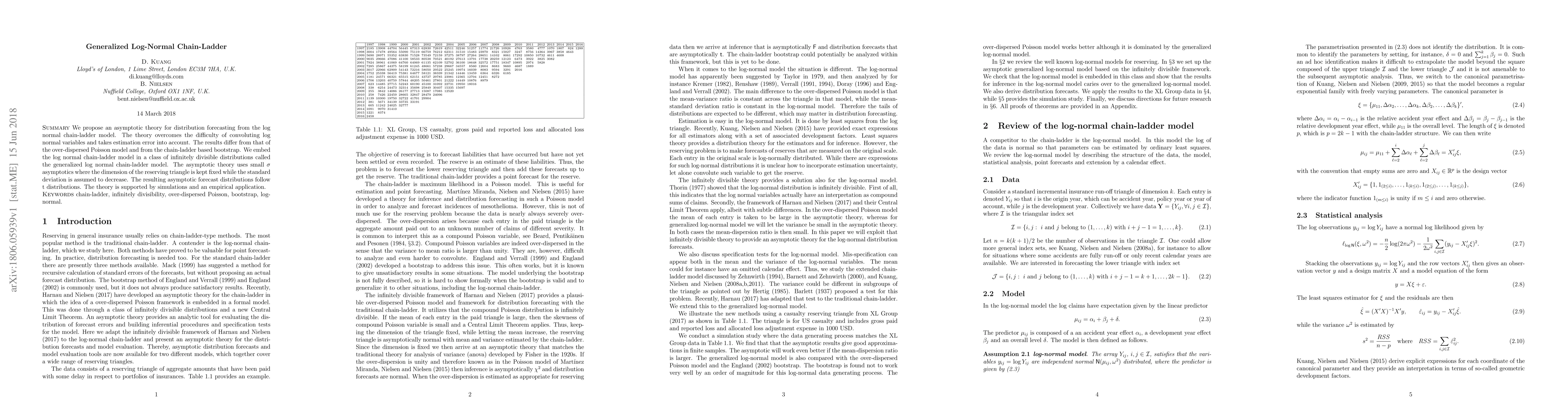 We propose an asymptotic theory for distribution forecasting from the log normal chain-ladder model. The theory overcomes the difficulty of convoluting log normal variables and takes estimation error into account. The results differ from that of the over-dispersed Poisson model and from the chain-ladder based bootstrap. We embed the log normal chain-ladder model in a class of infinitely divisible distributions called the generalized log normal chain-ladder model. The asymptotic theory uses small $\sigma$ asymptotics where the dimension of the reserving triangle is kept fixed while the standard deviation is assumed to decrease. The resulting asymptotic forecast distributions follow t distributions. The theory is supported by simulations and an empirical application.