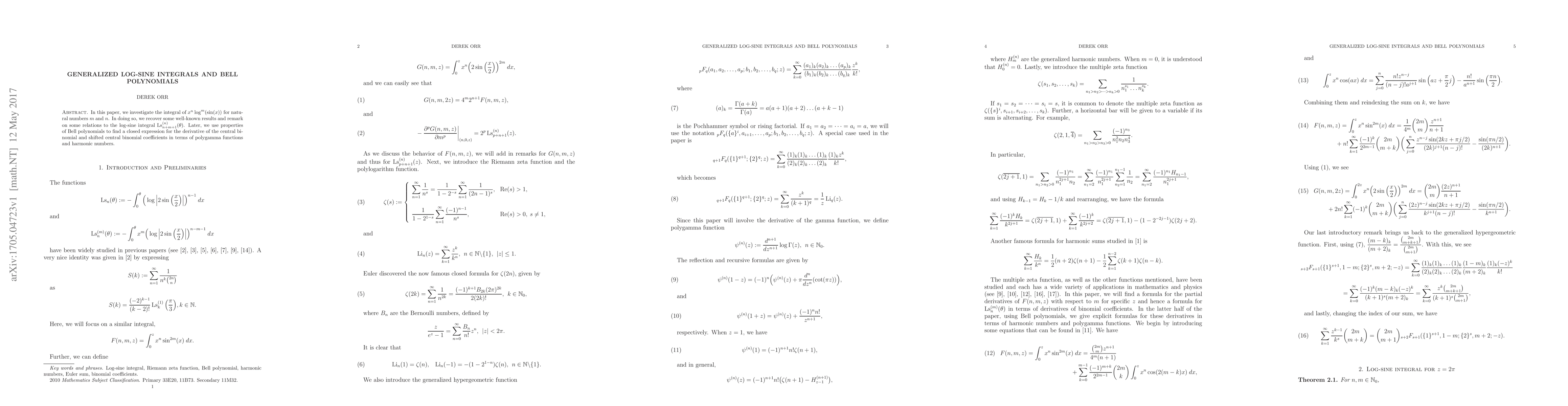 In this paper, we investigate the integral of $x^n\log^m(\sin(x))$ for natural numbers $m$ and $n$. In doing so, we recover some well-known results and remark on some relations to the log-sine integral $\operatorname{Ls}_{n+m+1}^{(n)}(\theta)$. Later, we use properties of Bell polynomials to find a closed expression for the derivative of the central binomial and shifted central binomial coefficients in terms of polygamma functions and harmonic numbers.