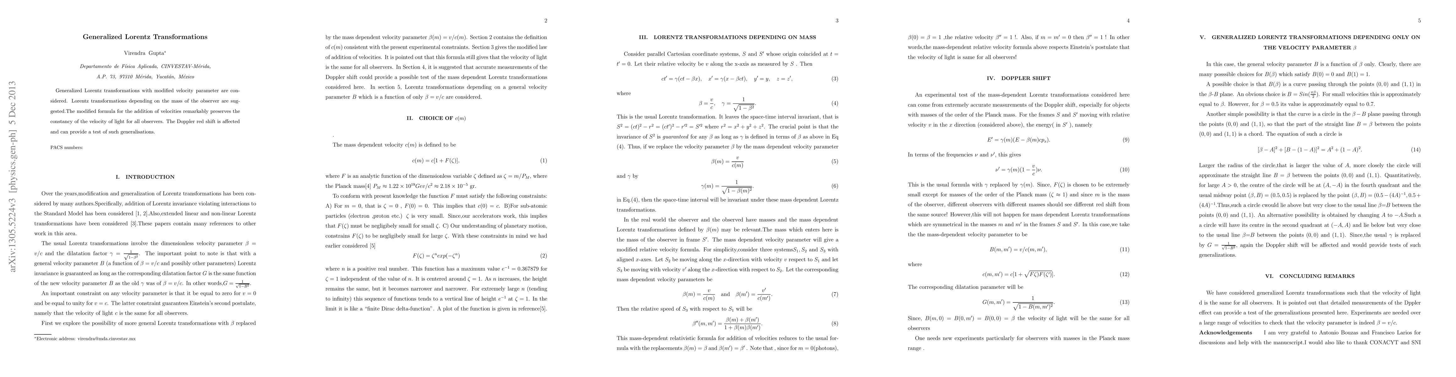 This paper proposes generalized Lorentz transformations that incorporate a modified velocity parameter and observer mass dependency, ensuring the constancy of light speed for all observers. The suggested velocity addition formula and its impact on Doppler red shift offer a potential test for these generalizations.