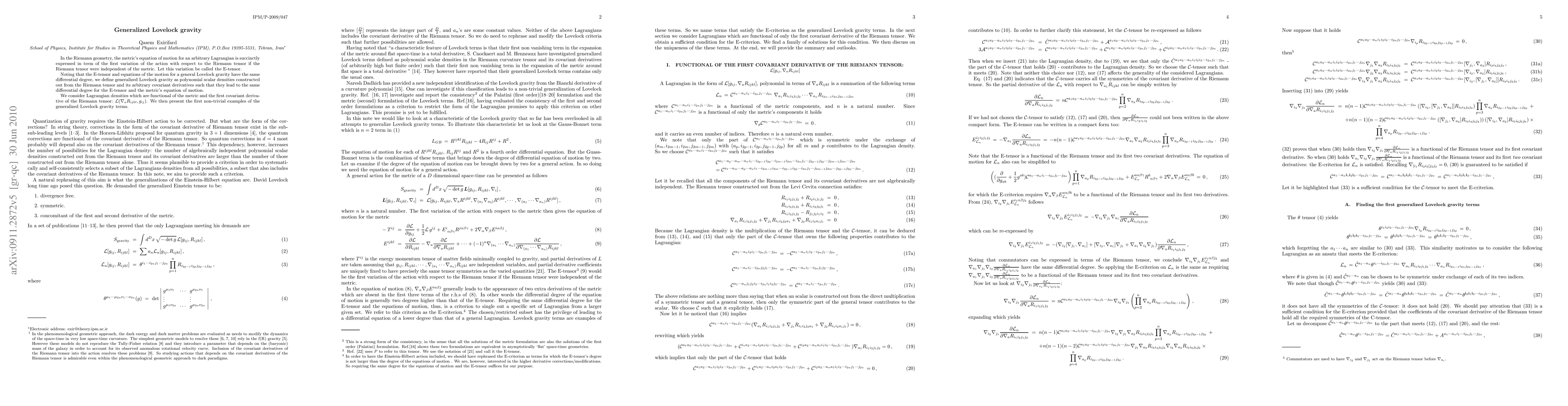 This paper introduces generalized Lovelock gravity, defining it as polynomial scalar densities derived from the Riemann tensor and its covariant derivatives that yield the same differential degree for the equations of motion as the E-tensor. The study focuses on Lagrangian densities that depend on the metric and the first covariant derivative of the Riemann tensor, presenting the first non-trivial examples of these terms.