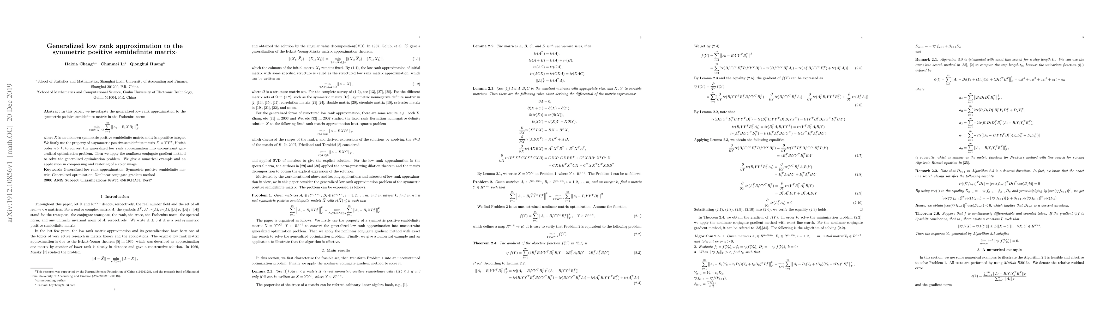 This paper explores the generalized low rank approximation for symmetric positive semidefinite matrices in the Frobenius norm, converting the problem into an unconstrained optimization issue using the property $X=YY^T$. It employs the nonlinear conjugate gradient method to solve the optimization and validates the approach with a numerical example.