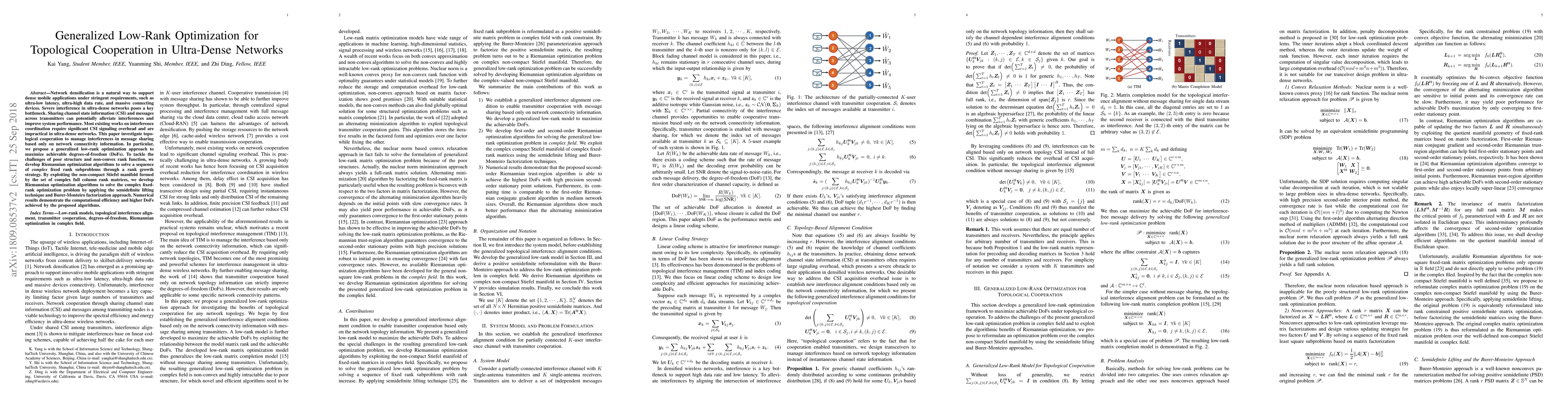 This paper proposes a generalized low-rank optimization approach to manage interference in ultra-dense networks through topological cooperation based on network connectivity information. It employs Riemannian optimization algorithms to tackle non-convex rank functions and achieve higher degrees-of-freedom (DoFs) without significant channel state information signaling overhead.