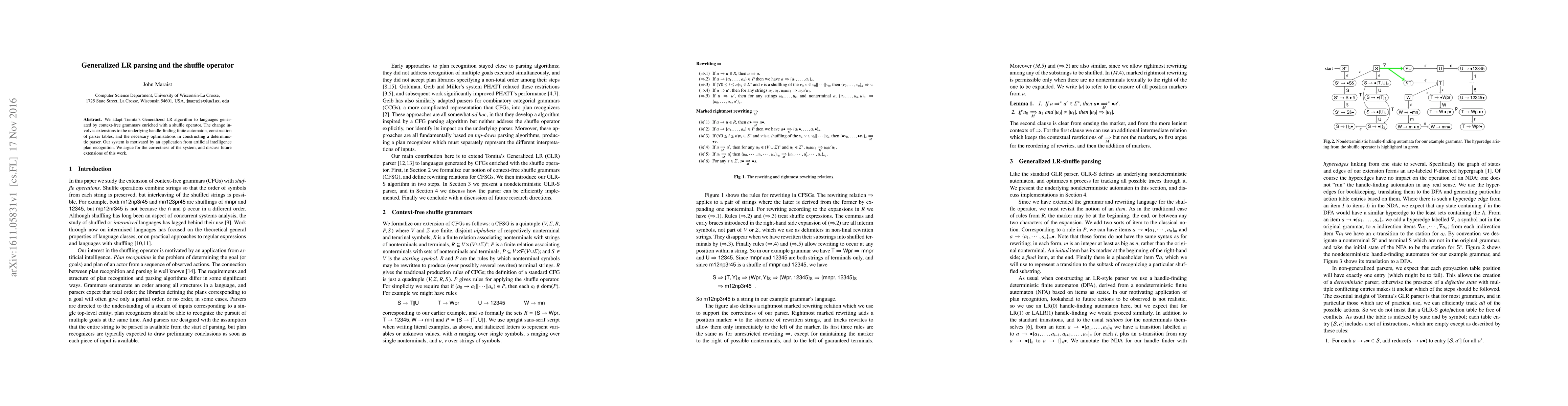 We adapt Tomita's Generalized LR algorithm to languages generated by context-free grammars enriched with a shuffle operator. The change involves extensions to the underlying handle-finding finite automaton, construction of parser tables, and the necessary optimizations in constructing a deterministic parser. Our system is motivated by an application from artificial intelligence plan recognition. We argue for the correctness of the system, and discuss future extensions of this work.