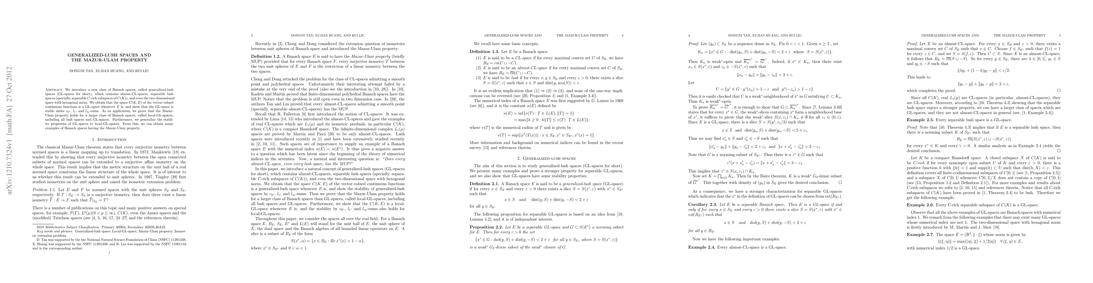 This paper introduces generalized-lush spaces (GL-spaces), a new class of Banach spaces that includes almost-CL-spaces, separable lush spaces, and two-dimensional hexagonal norm spaces. It demonstrates that GL-spaces are stable under $c_0$, $l_1$, and $l_\infty$ sums, and proves the Mazur-Ulam property for local-GL-spaces.