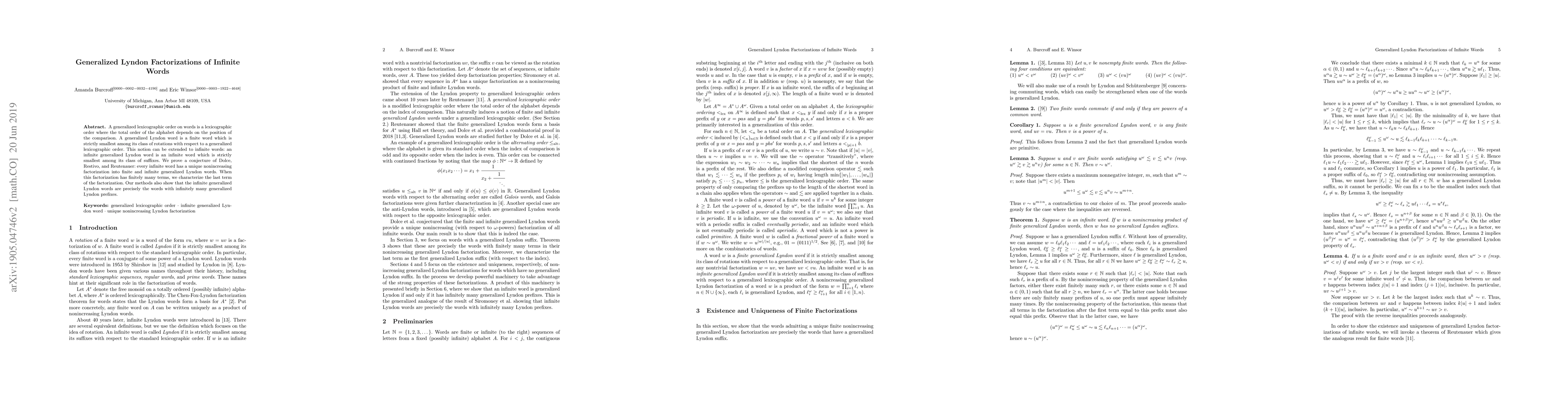 A generalized lexicographic order on words is a lexicographic order where the total order of the alphabet depends on the position of the comparison. A generalized Lyndon word is a finite word which is strictly smallest among its class of rotations with respect to a generalized lexicographic order. This notion can be extended to infinite words: an infinite generalized Lyndon word is an infinite word which is strictly smallest among its class of suffixes. We prove a conjecture of Dolce, Restivo, and Reutenauer: every infinite word has a unique nonincreasing factorization into finite and infinite generalized Lyndon words. When this factorization has finitely many terms, we characterize the last term of the factorization. Our methods also show that the infinite generalized Lyndon words are precisely the words with infinitely many generalized Lyndon prefixes.