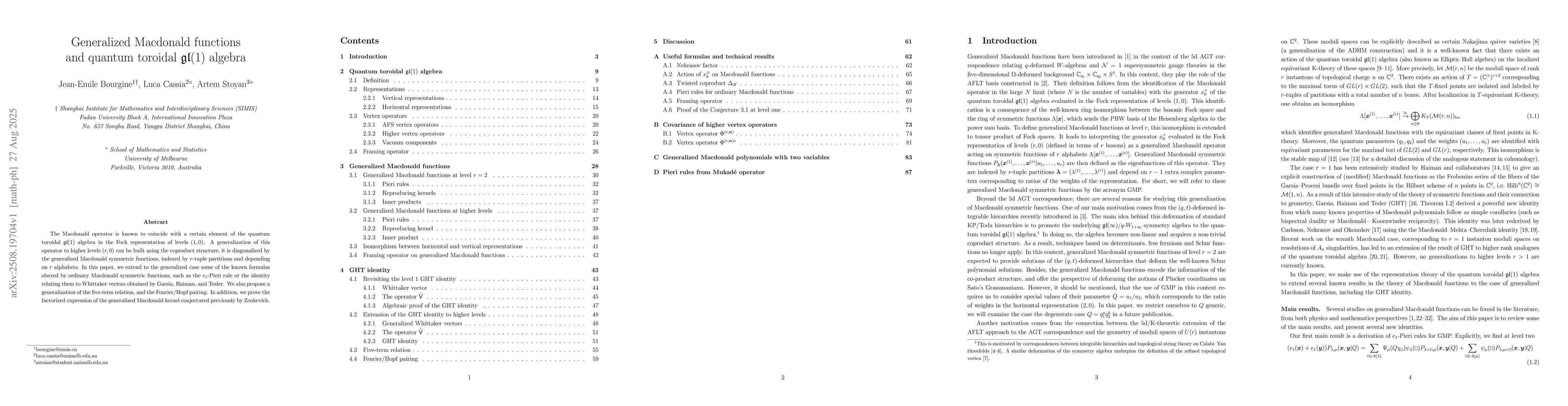 The Macdonald operator is known to coincide with a certain element of the quantum toroidal $\mathfrak{gl}(1)$ algebra in the Fock representation of levels $(1,0)$. A generalization of this operator to higher levels $(r,0)$ can be built using the coproduct structure, it is diagonalized by the generalized Macdonald symmetric functions, indexed by $r$-tuple partitions and depending on $r$ alphabets. In this paper, we extend to the generalized case some of the known formulas obeyed by ordinary Macdonald symmetric functions, such as the $e_1$-Pieri rule or the identity relating them to Whittaker vectors obtained by Garsia, Haiman, and Tesler. We also propose a generalization of the five-term relation, and the Fourier/Hopf pairing. In addition, we prove the factorized expression of the generalized Macdonald kernel conjectured previously by Zenkevich.