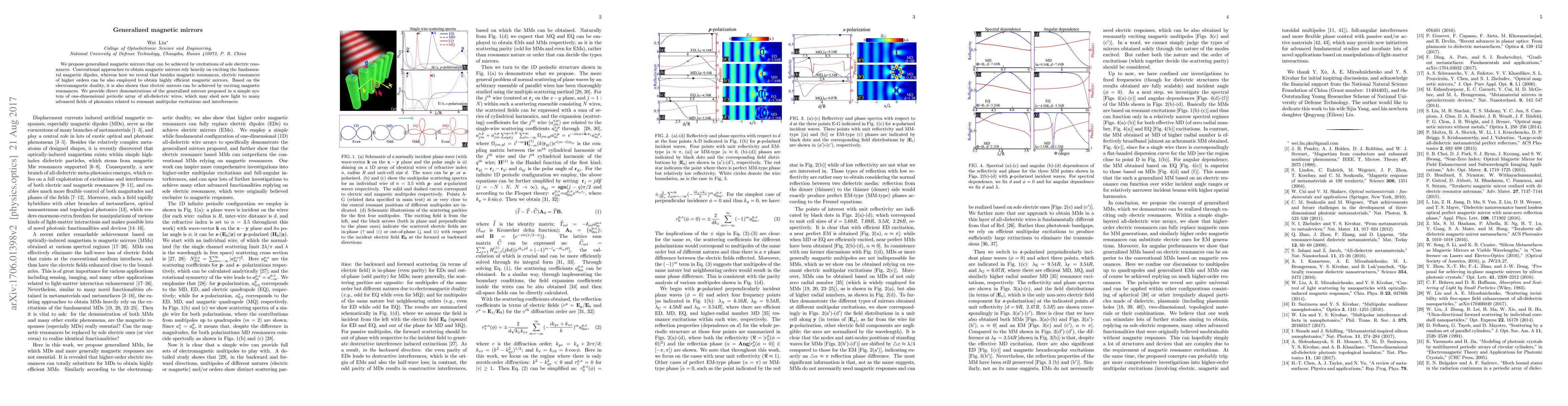 We propose generalized magnetic mirrors that can be achieved by excitations of sole electric resonances. Conventional approaches to obtain magnetic mirrors rely heavily on exciting the fundamental magnetic dipoles, whereas here we reveal that besides magnetic resonances, electric resonances of higher orders can be also employed to obtain highly efficient magnetic mirrors. Based on the electromagnetic duality, it is also shown that electric mirrors can be achieved by exciting magnetic resonances. We provide direct demonstrations of the generalized mirrors proposed in a simple system of one-dimensional periodic array of all-dielectric wires, which may shed new light to many advanced fields of photonics related to resonant multipolar excitations and interferences.