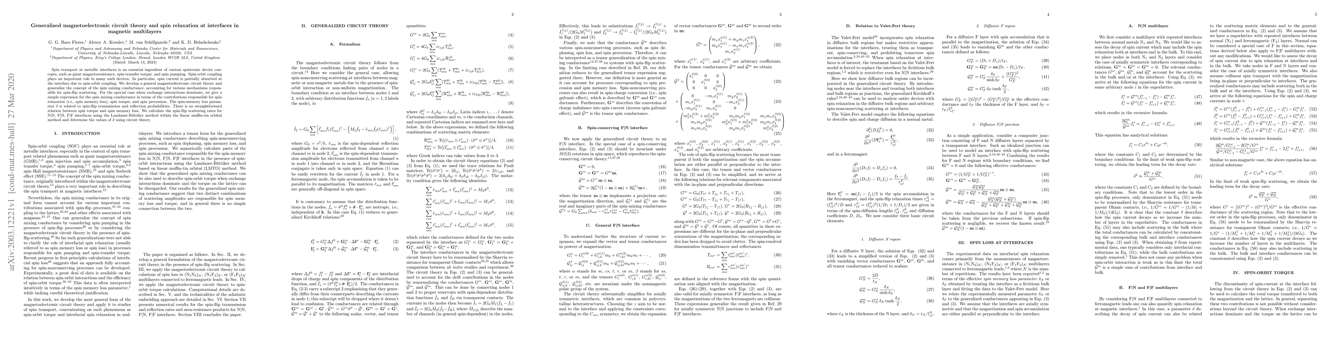 Spin transport at metallic interfaces is an essential ingredient of various spintronic device concepts, such as giant magnetoresistance, spin-transfer torque, and spin pumping. Spin-orbit coupling plays an important role in many such devices. In particular, spin current is partially absorbed at the interface due to spin-orbit coupling. We develop a general magnetoelectronic circuit theory and generalize the concept of the spin mixing conductance, accounting for various mechanisms responsible for spin-flip scattering. For the special case when exchange interactions dominate, we give a simple expression for the spin mixing conductance in terms of the contributions responsible for spin relaxation (i.e., spin memory loss), spin torque, and spin precession. The spin-memory loss parameter $\delta$ is related to spin-flip transmission and reflection probabilities. There is no straightforward relation between spin torque and spin memory loss. We calculate the spin-flip scattering rates for N|N, F|N, F|F interfaces using the Landauer-B\"uttiker method within the linear muffin-tin orbital method and determine the values of $\delta$ using circuit theory.