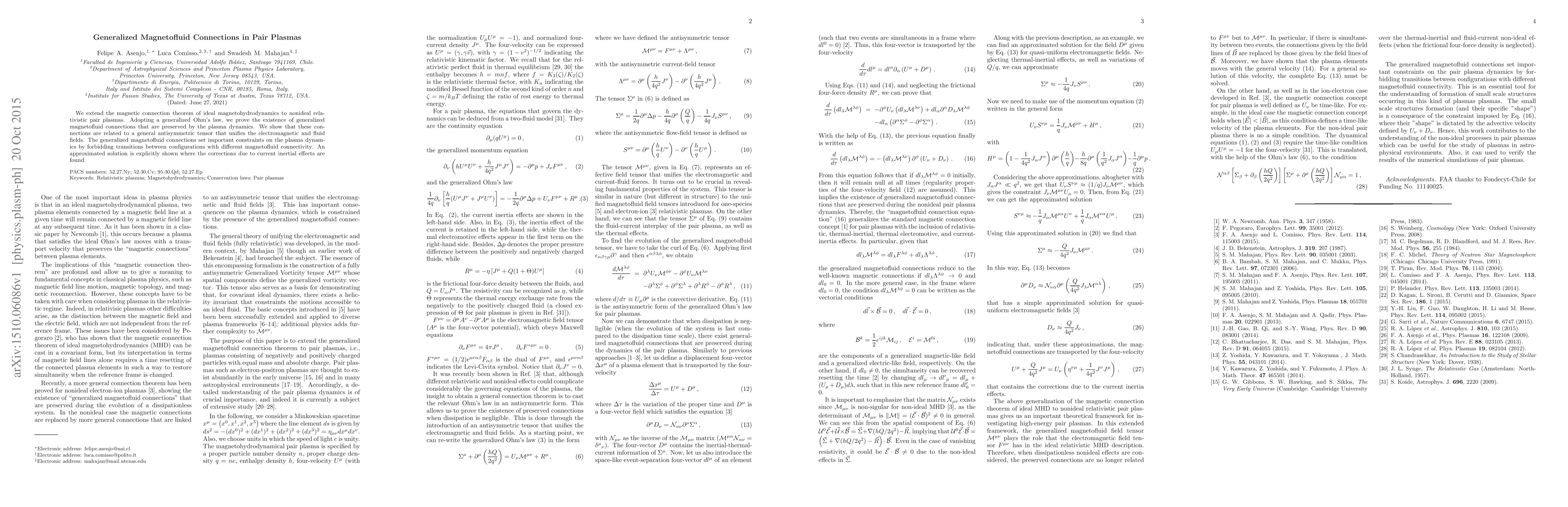 We extend the magnetic connection theorem of ideal magnetohydrodynamics to nonideal relativistic pair plasmas. Adopting a generalized Ohm's law, we prove the existence of generalized magnetofluid connections that are preserved by the plasma dynamics. We show that these connections are related to a general antisymmetric tensor that unifies the electromagnetic and fluid fields. The generalized magnetofluid connections set important constraints on the plasma dynamics by forbidding transitions between configurations with different magnetofluid connectivity. An approximated solution is explicitly shown where the corrections due to current inertial effects are found.