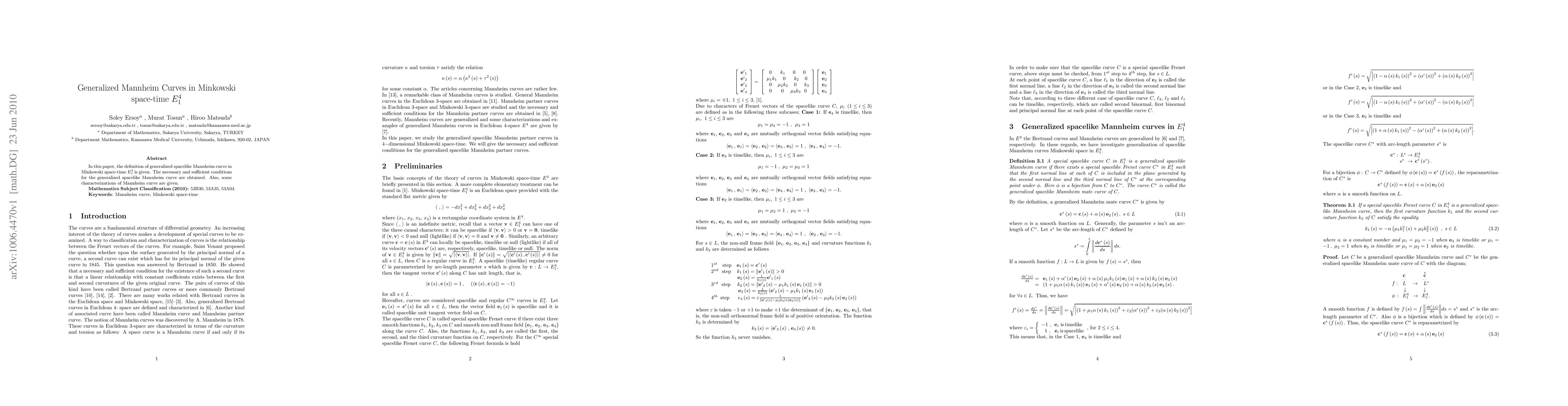 This paper defines generalized spacelike Mannheim curves in Minkowski space-time $E_1^4$ and provides necessary and sufficient conditions for their existence, along with some characterizations of these curves.