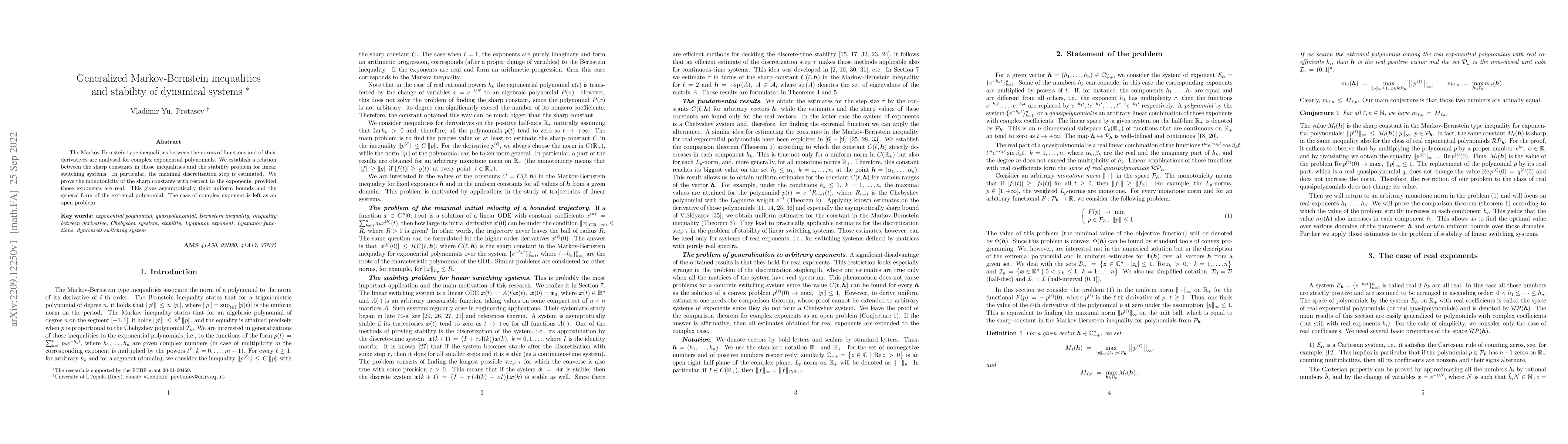 This paper analyzes Markov-Bernstein inequalities for complex exponential polynomials, linking the sharp constants to the stability of linear switching systems. It establishes monotonicity of these constants with real exponents, providing tight uniform bounds and the extremal polynomial form.