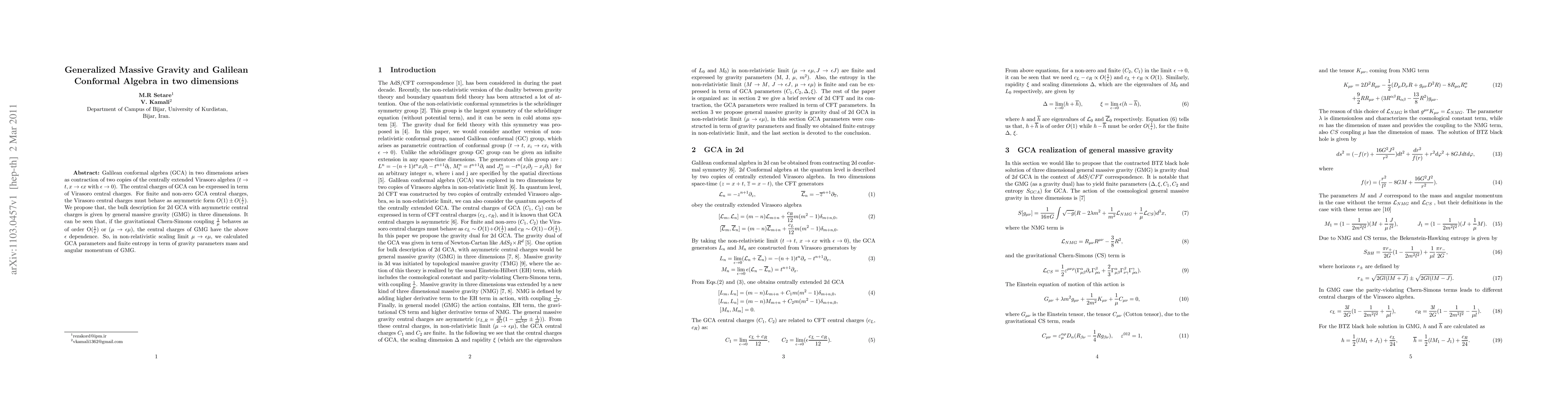 This paper explores the connection between the Galilean conformal algebra (GCA) in two dimensions and general massive gravity (GMG) in three dimensions, proposing that the bulk description for GCA with asymmetric central charges is given by GMG. It demonstrates that under a non-relativistic scaling limit, GMG parameters yield GCA parameters and finite entropy.
