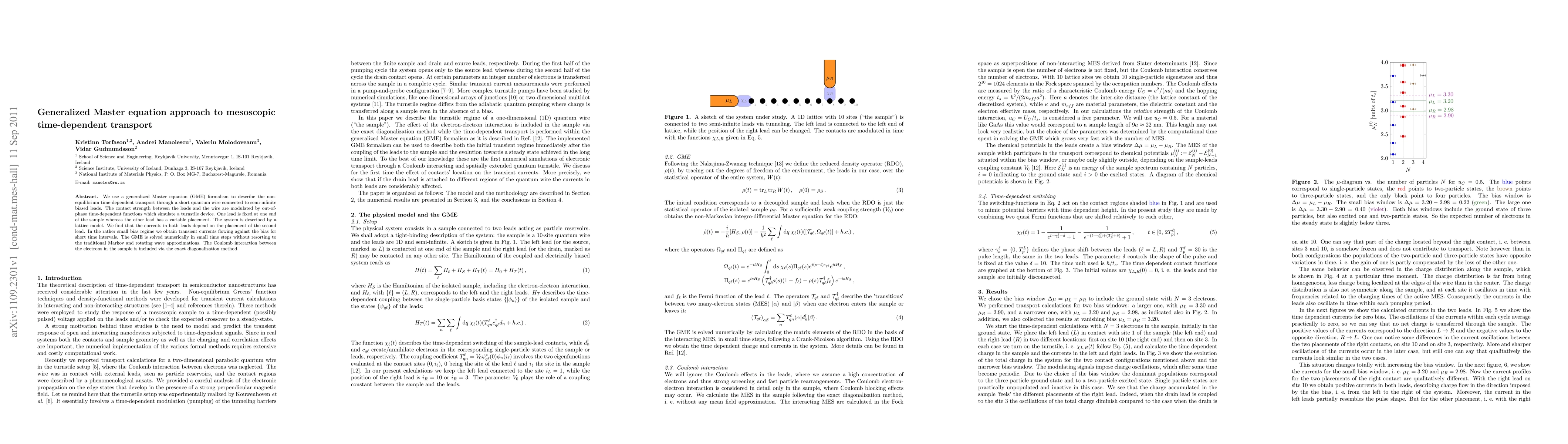 We use a generalized Master equation (GME) formalism to describe the non-equilibrium time-dependent transport through a short quantum wire connected to semi-infinite biased leads. The contact strength between the leads and the wire are modulated by out-of-phase time-dependent functions which simulate a turnstile device. One lead is fixed at one end of the sample whereas the other lead has a variable placement. The system is described by a lattice model. We find that the currents in both leads depend on the placement of the second lead. In the rather small bias regime we obtain transient currents flowing against the bias for short time intervals. The GME is solved numerically in small time steps without resorting to the traditional Markov and rotating wave approximations. The Coulomb interaction between the electrons in the sample is included via the exact diagonalization method.