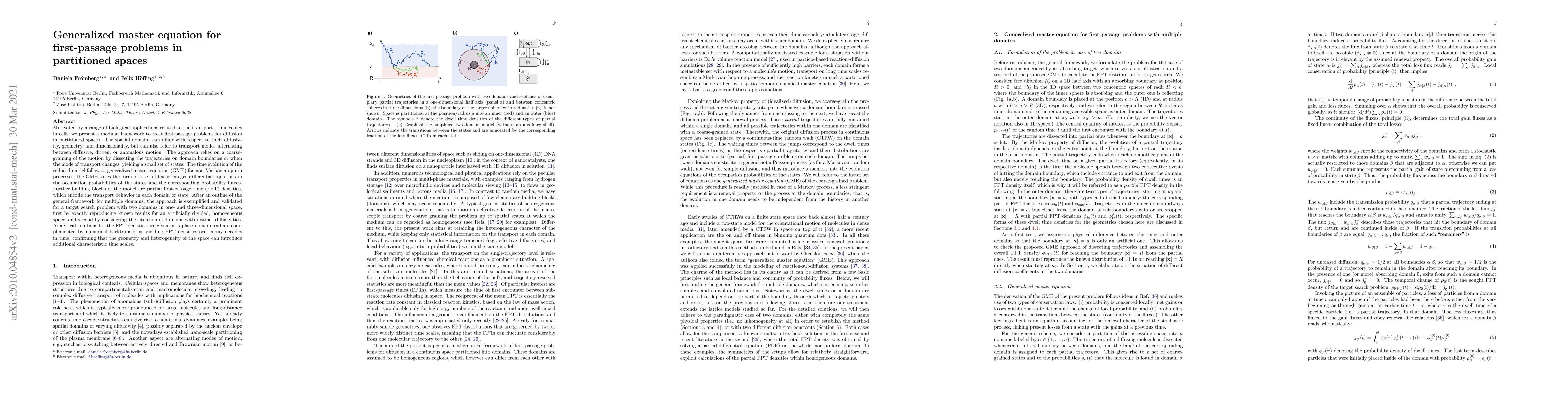 Motivated by a range of biological applications related to the transport of molecules in cells, we present a modular framework to treat first-passage problems for diffusion in partitioned spaces. The spatial domains can differ with respect to their diffusivity, geometry, and dimensionality, but can also refer to transport modes alternating between diffusive, driven, or anomalous motion. The approach relies on a coarse-graining of the motion by dissecting the trajectories on domain boundaries or when the mode of transport changes, yielding a small set of states. The time evolution of the reduced model follows a generalized master equation (GME) for non-Markovian jump processes; the GME takes the form of a set of linear integro-differential equations in the occupation probabilities of the states and the corresponding probability fluxes. Further building blocks of the model are partial first-passage time (FPT) densities, which encode the transport behavior in each domain or state. After an outline of the general framework for multiple domains, the approach is exemplified and validated for a target search problem with two domains in one- and three-dimensional space, first by exactly reproducing known results for an artificially divided, homogeneous space, and second by considering the situation of domains with distinct diffusivities. Analytical solutions for the FPT densities are given in Laplace domain and are complemented by numerical backtransforms yielding FPT densities over many decades in time, confirming that the geometry and heterogeneity of the space can introduce additional characteristic time scales.