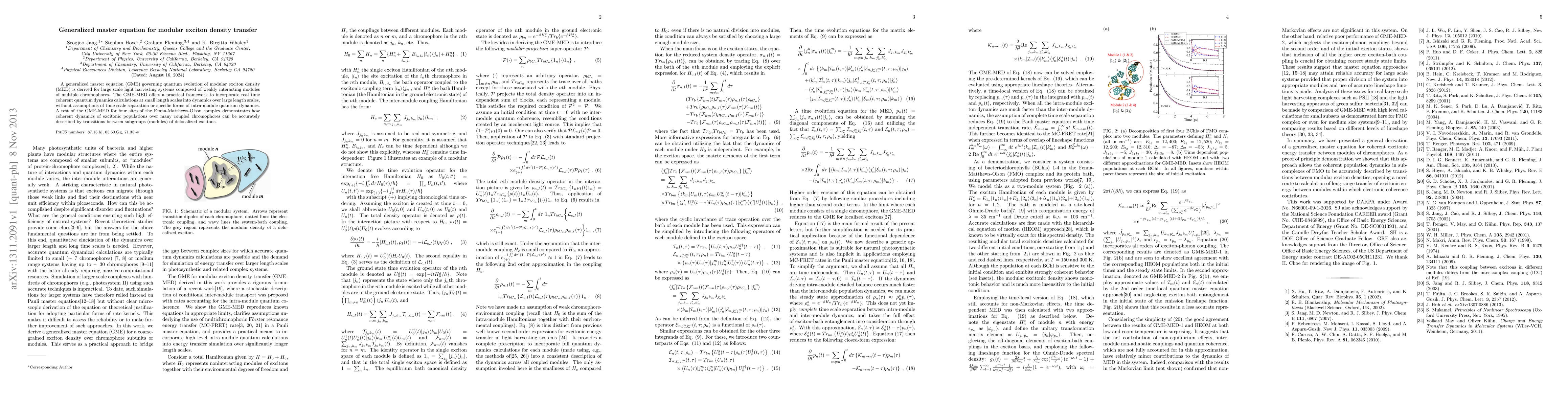 The paper derives a generalized master equation for modular exciton density transfer, providing a framework to incorporate real-time quantum dynamics in large-scale light harvesting systems without time scale separation assumptions. The method is tested on the Fenna-Matthews-Olson complex, showing accurate description of excitonic population dynamics through module transitions.