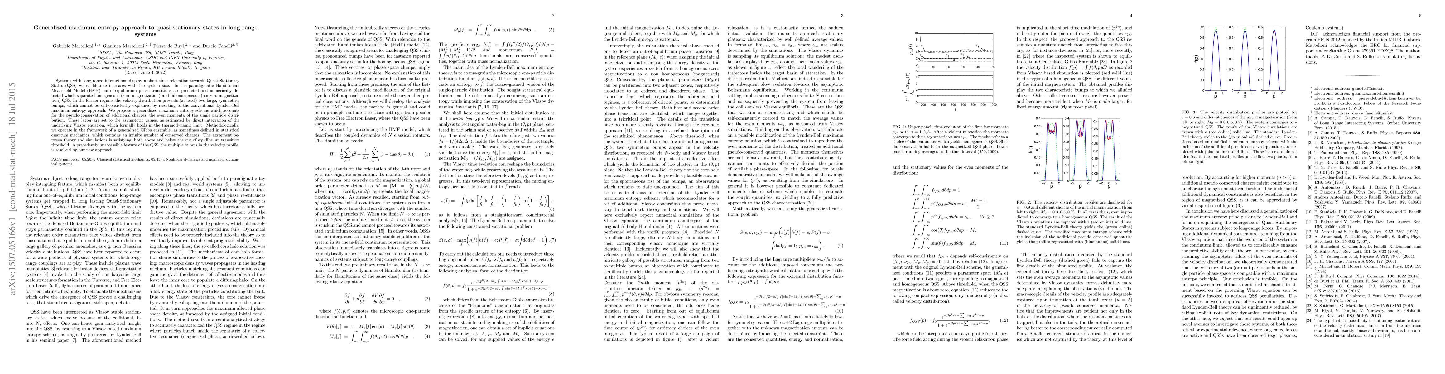 This paper proposes a generalized maximum entropy approach to study quasi-stationary states in long-range systems, particularly addressing the Hamiltonian Mean-field Model. It reveals that the conventional approach fails to explain the multiple bumps in the velocity distribution, which is resolved by incorporating additional conserved charges and even momenta.