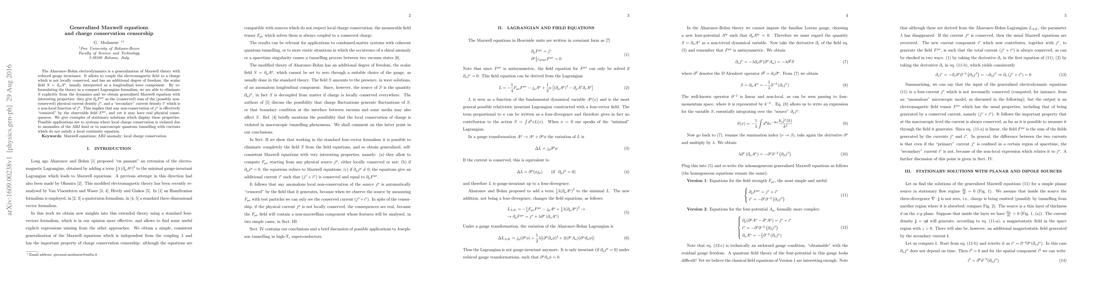 The Aharonov-Bohm electrodynamics is a generalization of Maxwell theory with reduced gauge invariance. It allows to couple the electromagnetic field to a charge which is not locally conserved, and has an additional degree of freedom, the scalar field $S=\partial_\alpha A^\alpha$, usually interpreted as a longitudinal wave component. By re-formulating the theory in a compact Lagrangian formalism, we are able to eliminate $S$ explicitly from the dynamics and we obtain generalized Maxwell equation with interesting properties: they give $\partial_\mu F^{\mu \nu}$ as the (conserved) sum of the (possibly non-conserved) physical current density $j^\nu$, and a "secondary" current density $i^\nu$ which is a non-local function of $j^\nu$. This implies that any non-conservation of $j^\nu$ is effectively "censored" by the observable field $F^{\mu \nu}$, and yet it may have real physical consequences. We give examples of stationary solutions which display these properties. Possible applications are to systems where local charge conservation is violated due to anomalies of the ABJ kind or to macroscopic quantum tunnelling with currents which do not satisfy a local continuity equation.
