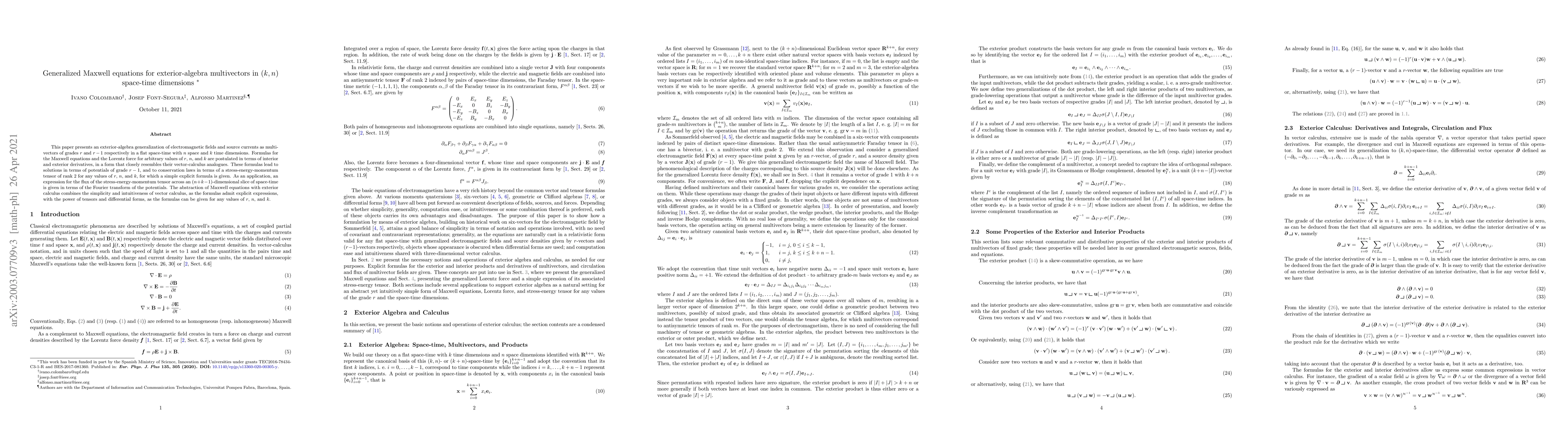 This paper presents an exterior-algebra generalization of electromagnetic fields and source currents as multivectors of grades $r$ and $r-1$ respectively in a flat space-time with $n$ space and $k$ time dimensions. Formulas for the Maxwell equations and the Lorentz force for arbitrary values of $r$, $n$, and $k$ are postulated in terms of interior and exterior derivatives, in a form that closely resembles their vector-calculus analogues. These formulas lead to solutions in terms of potentials of grade $r-1$, and to conservation laws in terms of a stress-energy-momentum tensor of rank 2 for any values of $r$, $n$, and $k$, for which a simple explicit formula is given. As an application, an expression for the flux of the stress-energy-momentum tensor across an $(n+k-1)$-dimensional slice of space-time is given in terms of the Fourier transform of the potentials. The abstraction of Maxwell equations with exterior calculus combines the simplicity and intuitiveness of vector calculus, as the formulas admit explicit expressions, with the power of tensors and differential forms, as the formulas can be given for any values of $r$, $n$, and $k$.