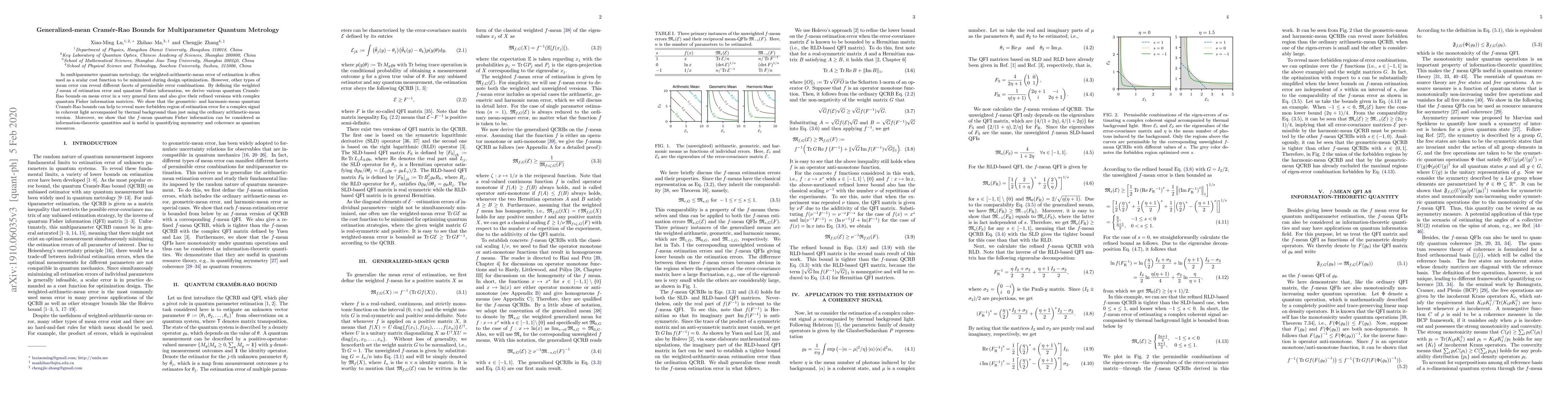 This paper derives generalized-mean quantum Cramér-Rao bounds for multiparameter quantum metrology, using the weighted $f$-mean of estimation error. It demonstrates that geometric- and harmonic-mean bounds reveal more about the forbidden region of estimation error compared to the arithmetic-mean version, and introduces the $f$-mean quantum Fisher information as an information-theoretic measure for asymmetry and coherence.