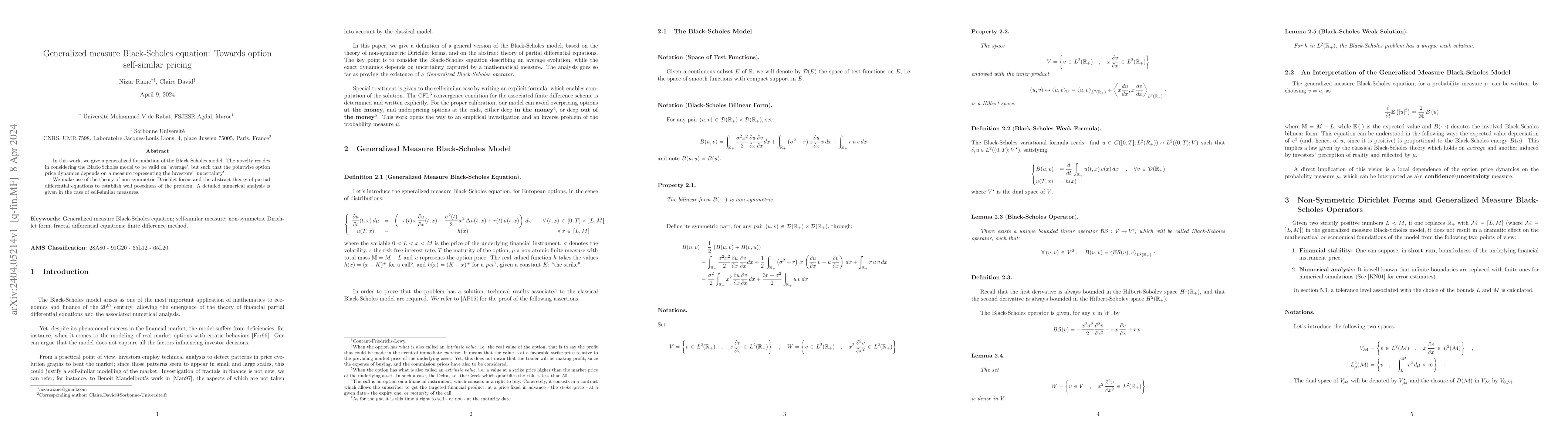 This paper presents a generalized Black-Scholes model where option pricing dynamics depend on a measure reflecting investors' uncertainty. It leverages non-symmetric Dirichlet forms and PDE theory to ensure well-posedness, with a numerical analysis focusing on self-similar measures.