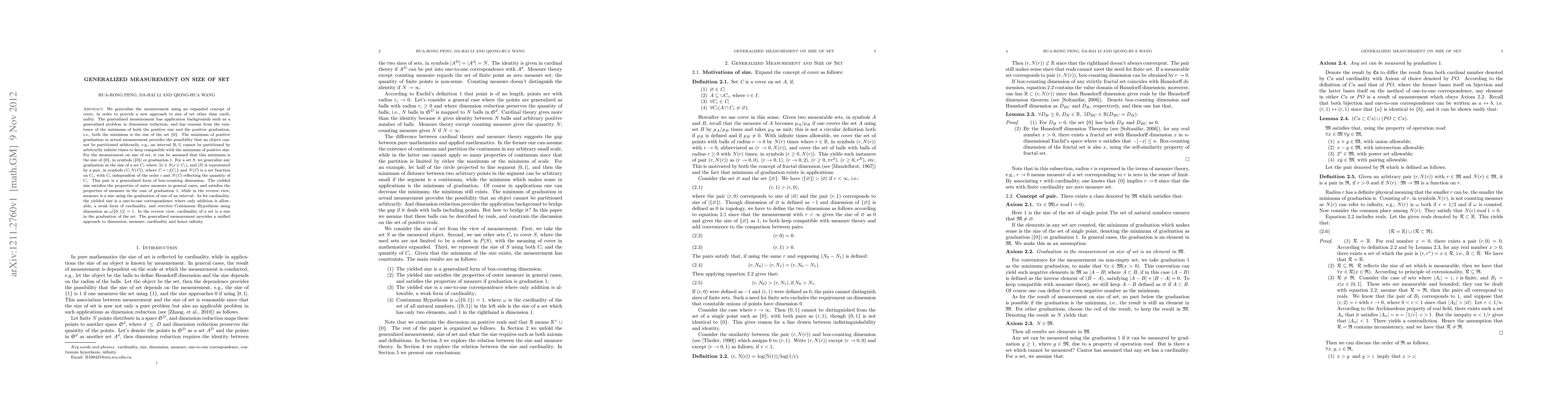 We generalize the measurement using an expanded concept of cover, in order to provide a new approach to size of set other than cardinality. The generalized measurement has application backgrounds such as a generalized problem in dimension reduction, and has reasons from the existence of the minimum of both the positive size and the positive graduation, i.e., both the minimum is the size of the set ${0}$. The minimum of positive graduation in actual measurement provides the possibility that an object cannot be partitioned arbitrarily, e.g., an interval $[0, 1]$ cannot be partitioned by arbitrarily infinite times to keep compatible with the minimum of positive size. For the measurement on size of set, it can be assumed that this minimum is the size of ${0}$, in symbols $|{0}|$ or graduation 1. For a set $S$, we generalize any graduation as the size of a set $C_i$ where $\exists x \in S (x \in C_i)$, and $|S|$ is represented by a pair, in symbols $(C, N(C))$, where ${C} = \cup {C_i}$ and $N(C)$ is a set function on $C_i$, with $C_i$ independent of the order $i$ and $N(C)$ reflecting the quantity of $C_i$. This pair is a generalized form of box-counting dimension. The yielded size satisfies the properties of outer measure in general cases, and satisfies the properties of measure in the case of graduation 1; while in the reverse view, measure is a size using the graduation of size of an interval. As for cardinality, the yielded size is a one-to-one correspondence where only addition is allowable, a weak form of cardinality, and rewrites Continuum Hypothesis using dimension as $\omega \dot |{0,1}| = 1$. In the reverse view, cardinality of a set is a size in the graduation of the set. The generalized measurement provides a unified approach to dimension, measure, cardinality and hence infinity.