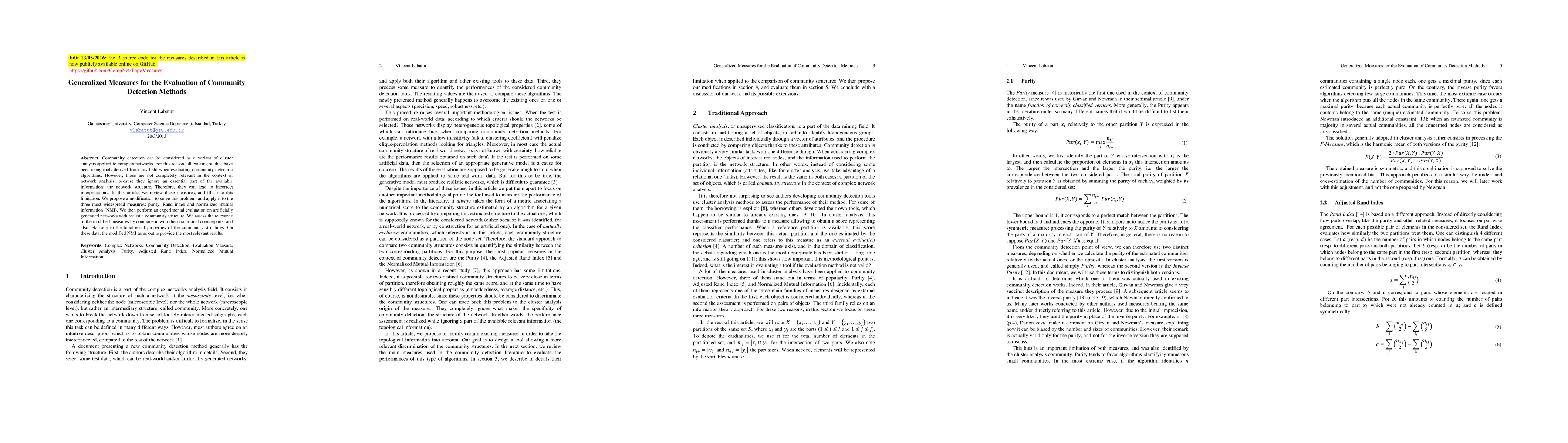 This paper reviews existing community detection evaluation measures, highlighting their limitations in network analysis. It proposes modified versions of purity, Rand index, and normalized mutual information (NMI), and demonstrates their effectiveness through experiments on artificially generated networks, showing that the modified NMI provides the most relevant results.