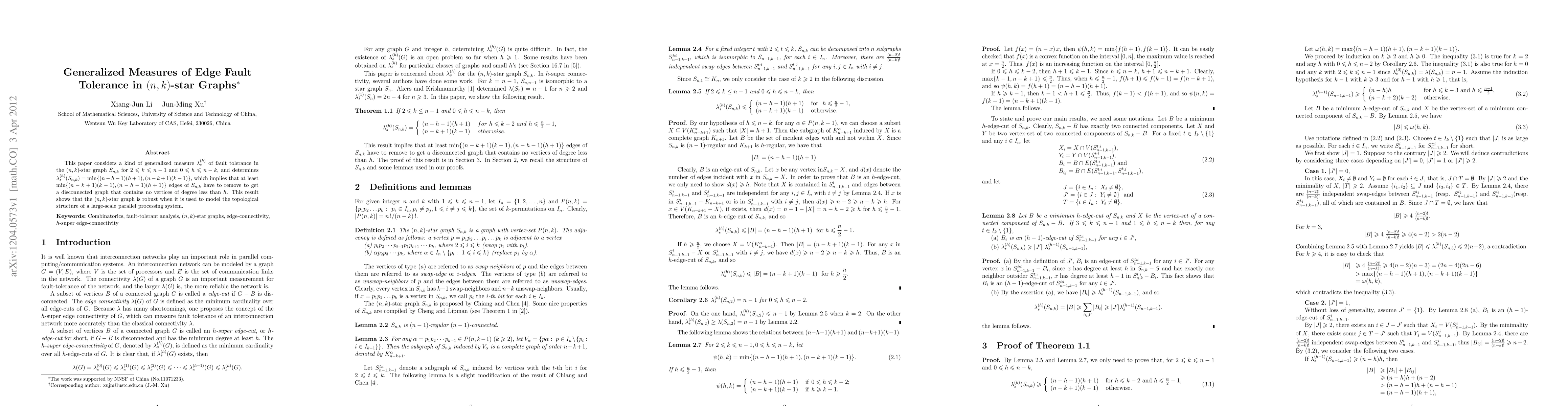 A new measure of fault tolerance is introduced for (n,k)-star graphs, showing that at least a certain number of edges must be removed to disconnect the graph without leaving vertices with low degree, making these graphs robust for modeling large-scale parallel processing systems.