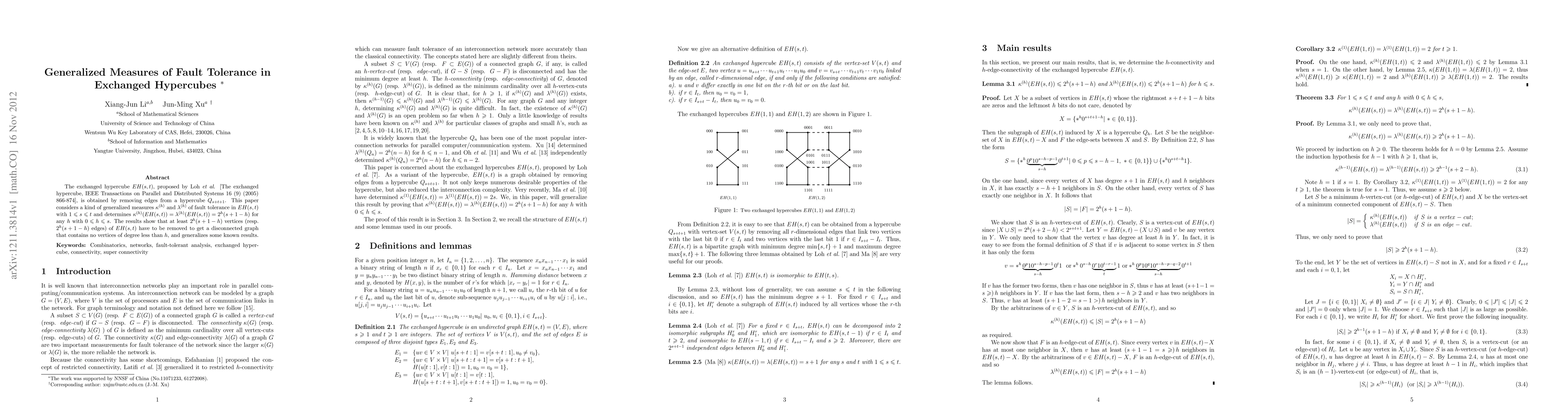 This paper investigates generalized measures of fault tolerance in exchanged hypercubes, determining that $\kappa^{(h)}(EH(s,t))=\lambda^{(h)}(EH(s,t))= 2^h(s+1-h)$ for $0\leqslant h\leqslant s$. It concludes that at least $2^h(s+1-h)$ vertices or edges must be removed to disconnect the graph, generalizing previous results.