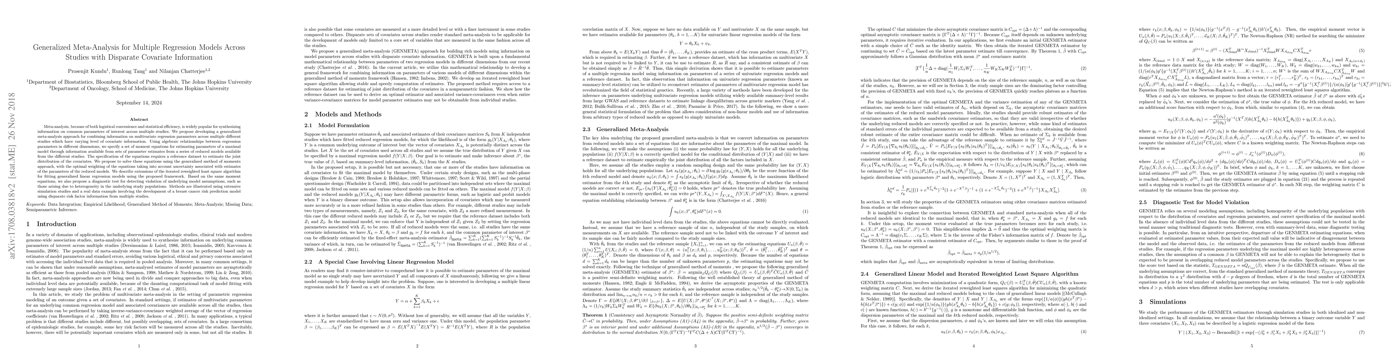 This paper proposes a generalized meta-analysis approach for combining multivariate regression parameters across studies with varying covariate information, using moment equations and the generalized method of moments. It also introduces a diagnostic test for model assumption violations and demonstrates the method with simulations and a breast cancer risk prediction model.