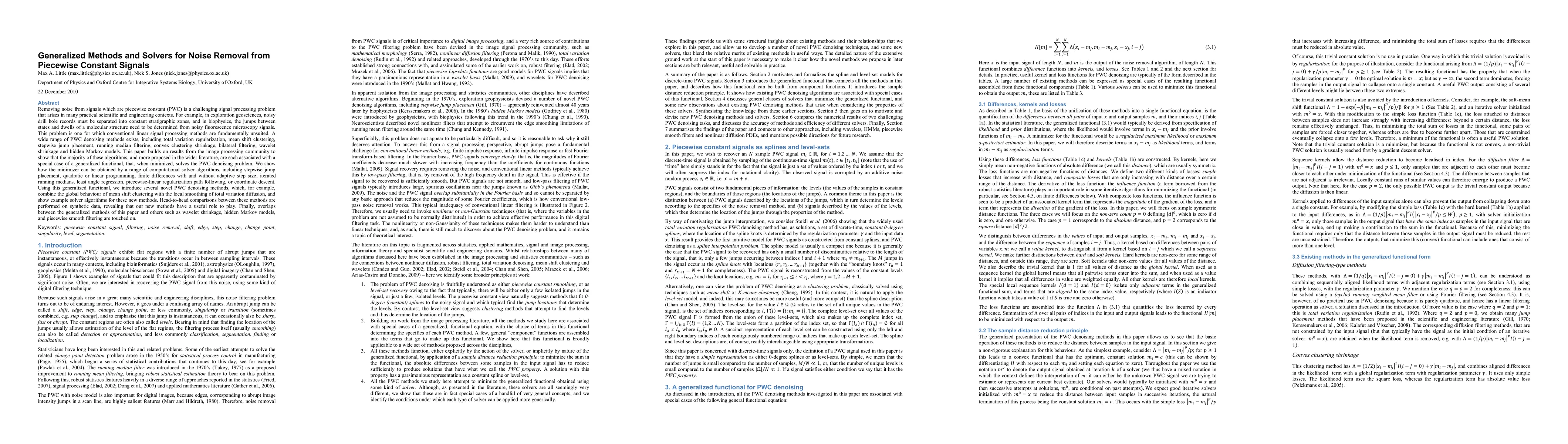 Removing noise from piecewise constant (PWC) signals, is a challenging signal processing problem arising in many practical contexts. For example, in exploration geosciences, noisy drill hole records need separating into stratigraphic zones, and in biophysics, jumps between molecular dwell states need extracting from noisy fluorescence microscopy signals. Many PWC denoising methods exist, including total variation regularization, mean shift clustering, stepwise jump placement, running medians, convex clustering shrinkage and bilateral filtering; conventional linear signal processing methods are fundamentally unsuited however. This paper shows that most of these methods are associated with a special case of a generalized functional, minimized to achieve PWC denoising. The minimizer can be obtained by diverse solver algorithms, including stepwise jump placement, convex programming, finite differences, iterated running medians, least angle regression, regularization path following, and coordinate descent. We introduce novel PWC denoising methods, which, for example, combine global mean shift clustering with local total variation smoothing. Head-to-head comparisons between these methods are performed on synthetic data, revealing that our new methods have a useful role to play. Finally, overlaps between the methods of this paper and others such as wavelet shrinkage, hidden Markov models, and piecewise smooth filtering are touched on.
