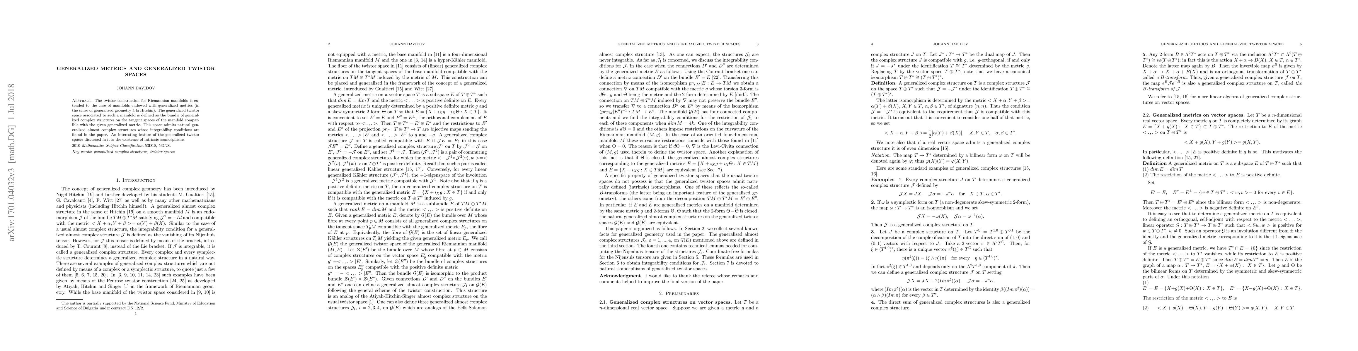 The twistor construction for Riemannian manifolds is extended to the case of manifolds endowed with generalized metrics (in the sense of generalized geometry \`a la Hitchin). The generalized twistor space associated to such a manifold is defined as the bundle of generalized complex structures on the tangent spaces of the manifold compatible with the given generalized metric. This space admits natural generalized almost complex structures whose integrability conditions are found in the paper. An interesting feature of the generalized twistor spaces discussed in it is the existence of intrinsic isomorphisms.