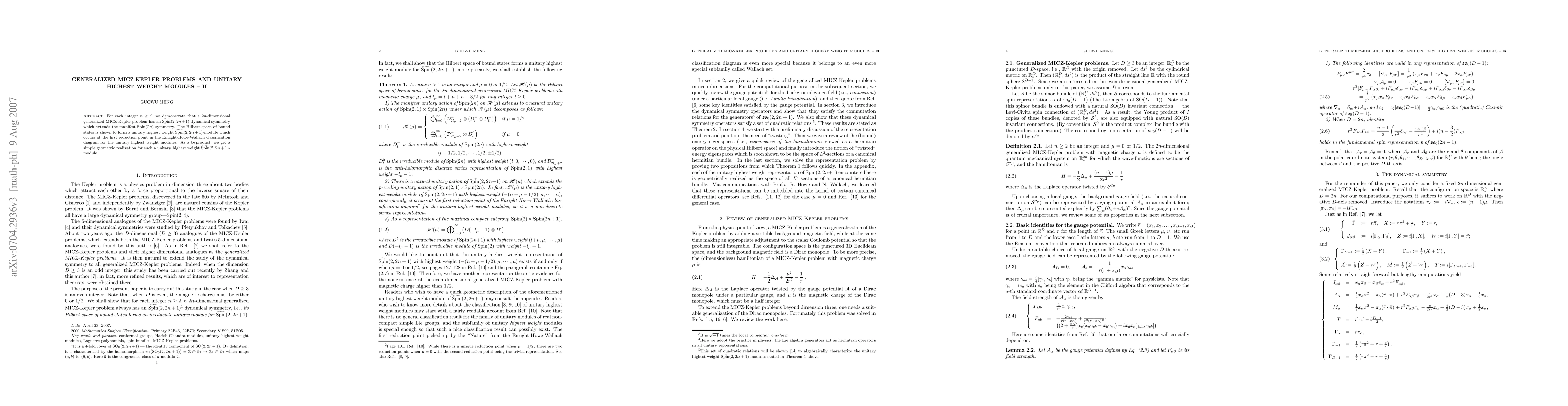 The paper demonstrates that a 2n-dimensional generalized MICZ-Kepler problem exhibits an extended dynamical symmetry of $\widetilde{\mr{Spin}}(2, 2n+1)$, forming a unitary highest weight module at the first reduction point in the Enright-Howe-Wallach classification. A simple geometric realization for this module is also provided.