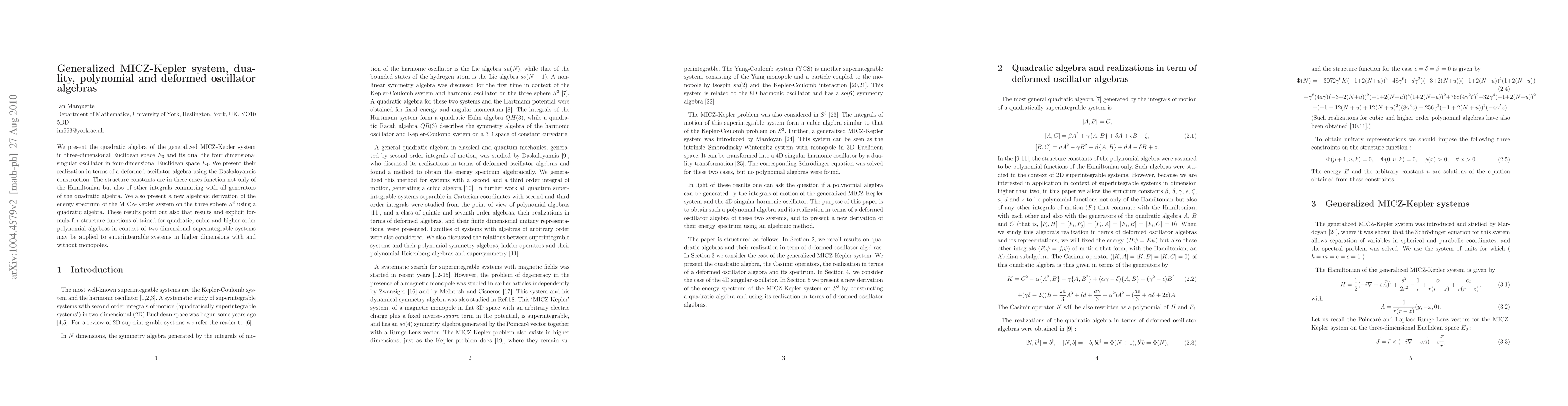 This paper explores the quadratic algebra of the generalized MICZ-Kepler system and its dual, presenting their realization via a deformed oscillator algebra. It demonstrates that the system's structure constants depend on multiple commuting integrals, and derives the energy spectrum using a quadratic algebra, extending these findings to higher-dimensional superintegrable systems.