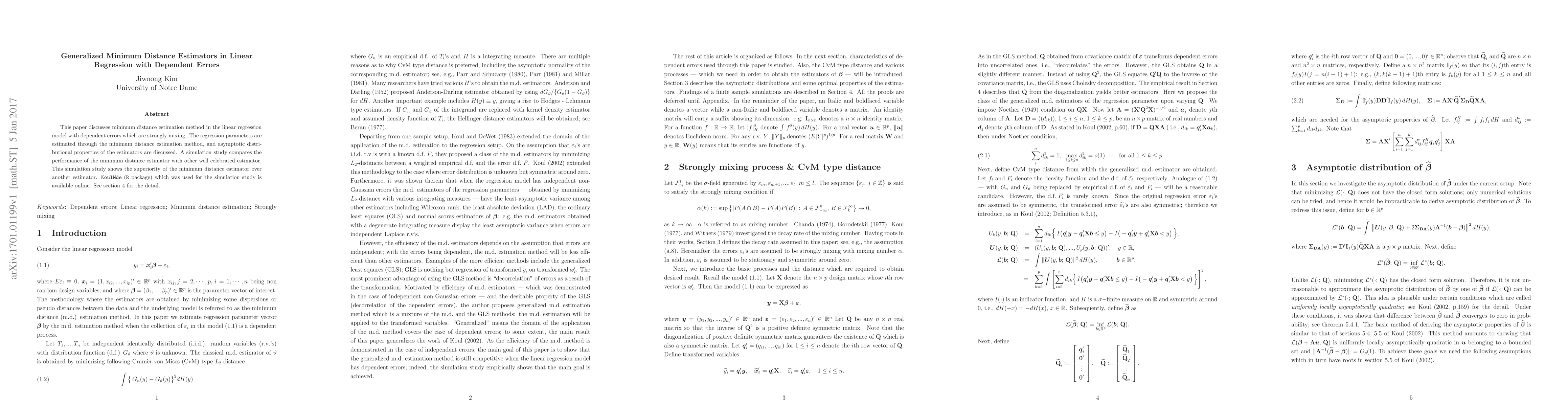 This paper proposes minimum distance estimators for linear regression models with strongly mixing dependent errors, discussing their asymptotic properties and comparing them to other estimators via simulation. The study finds the minimum distance estimator to be superior, with the R package KoulMde used for simulations available online.