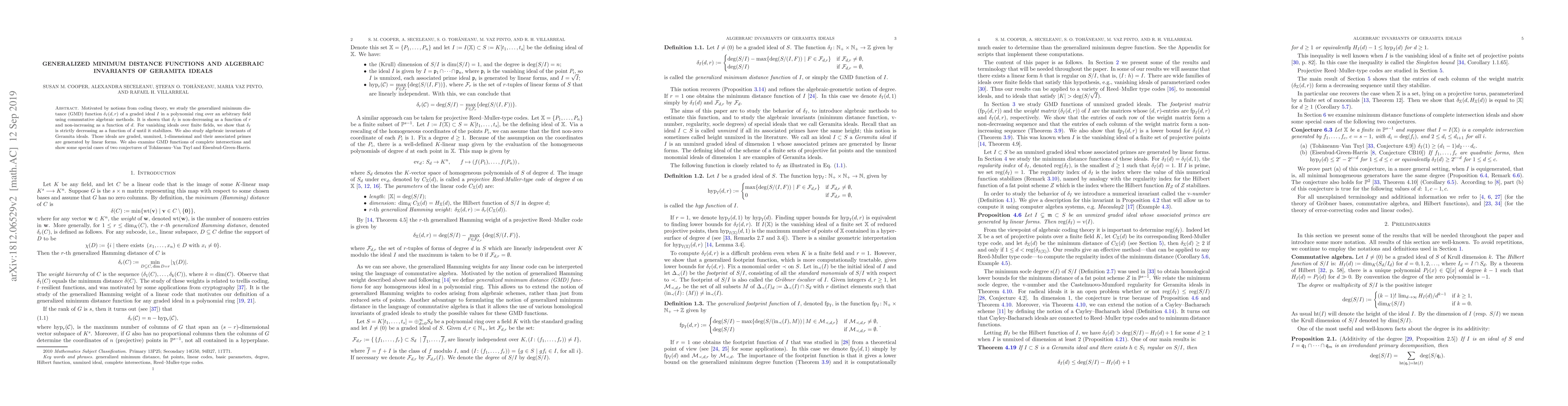 Motivated by notions from coding theory, we study the generalized minimum distance (GMD) function $\delta_I(d,r)$ of a graded ideal $I$ in a polynomial ring over an arbitrary field using commutative algebraic methods. It is shown that $\delta_I$ is non-decreasing as a function of $r$ and non-increasing as a function of $d$. For vanishing ideals over finite fields, we show that $\delta_I$ is strictly decreasing as a function of $d$ until it stabilizes. We also study algebraic invariants of Geramita ideals. Those ideals are graded, unmixed, $1$-dimensional and their associated primes are generated by linear forms. We also examine GMD functions of complete intersections and show some special cases of two conjectures of Toh\u{a}neanu--Van Tuyl and Eisenbud-Green-Harris.