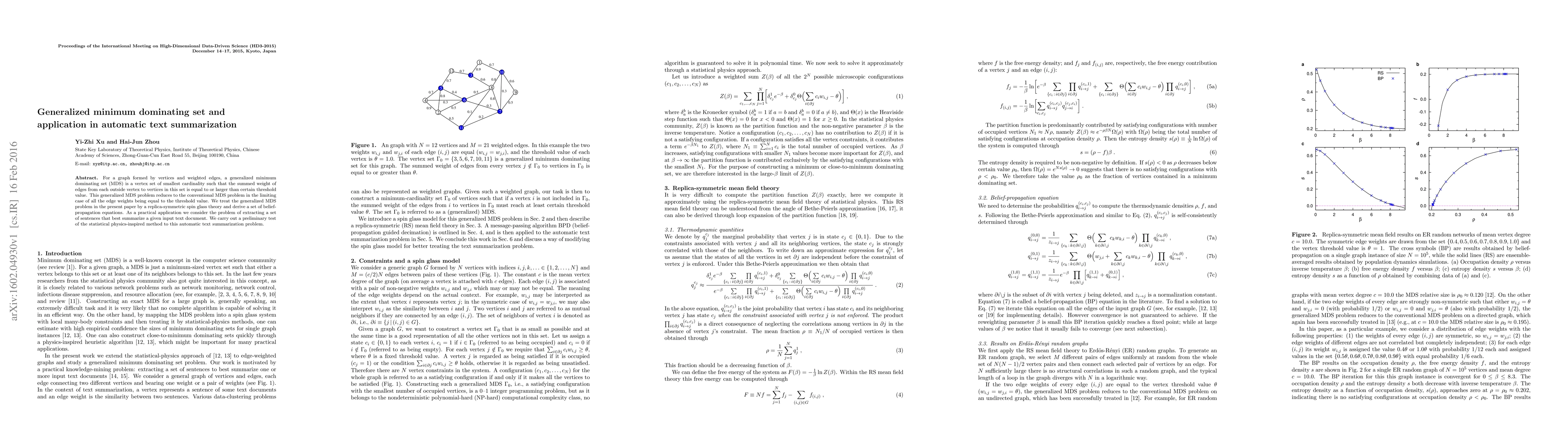 This paper addresses the generalized minimum dominating set (MDS) problem using replica-symmetric spin glass theory, deriving belief-propagation equations. It applies this approach to automatic text summarization by extracting a concise set of sentences that best represent a given document.