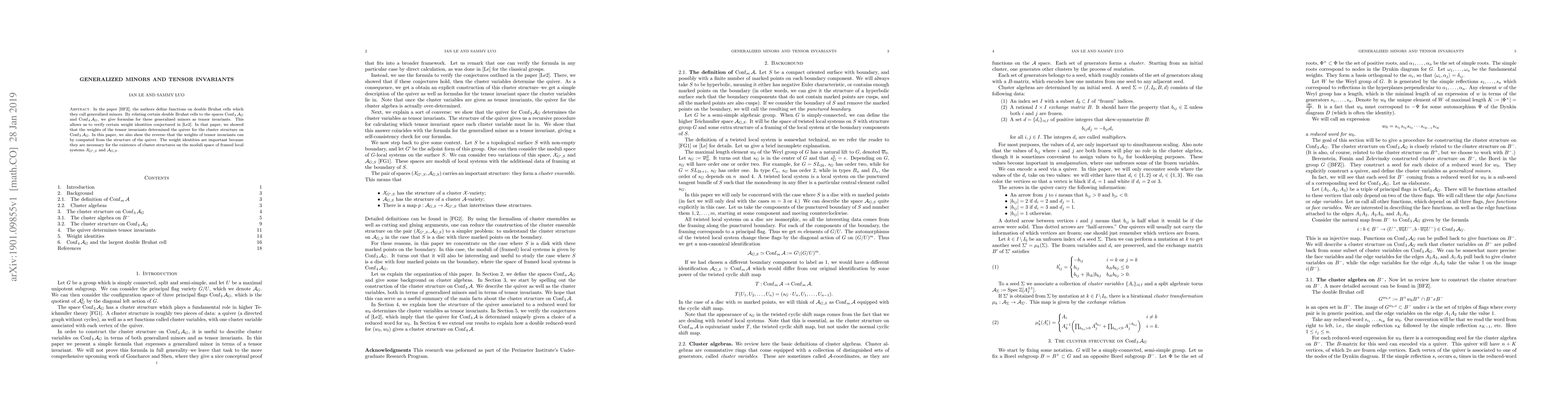 Berenstein, Fomin and Zelevinsky defined functions on double Bruhat cells which they called generalized minors. By relating certain double Bruhat cells to configuration spaces of flags, we give formulas for these generalized minors as tensor invariants. This allows us to verify certain weight identities. The weights of the tensor invariants can then be used to construct the quiver for the cluster structure on the configuration space of three flags. We also show a converse statement--that the weights of tensor invariants can by computed from the structure of the quiver. The weight identities are important because they are necessary for the existence of cluster structures on the moduli space of framed local systems.