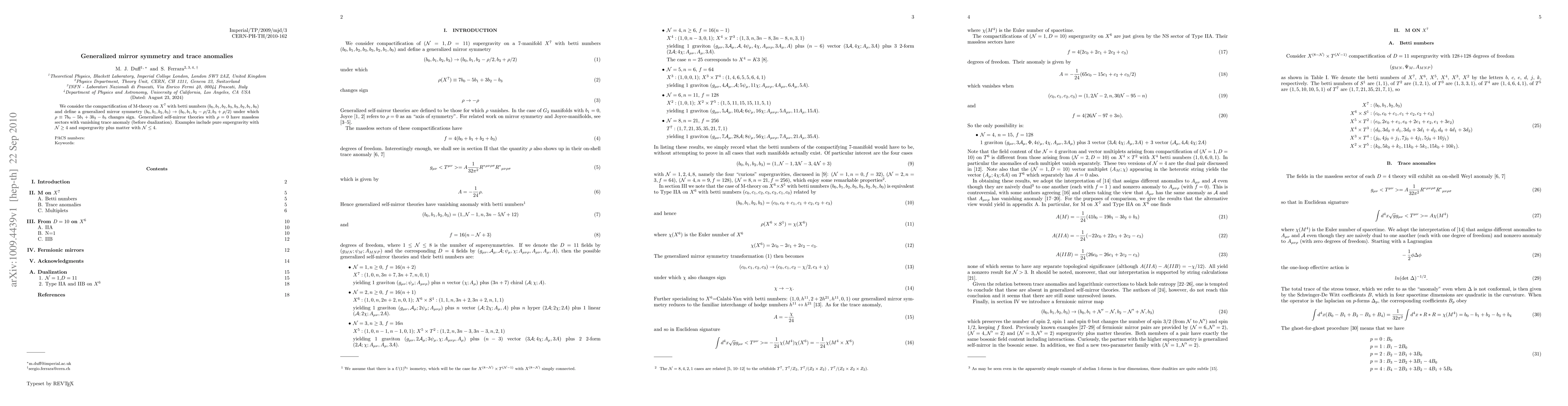 We consider compactification of M-theory on X7 with betti numbers (b_0, b_1, b_2, b_3, b_3, b_2, b_1, b_0) and define a generalized mirror symmetry (b_0, b_1, b_2, b_3) goes to (b_0, b_1, b_2 -rho/2, b_3+rho/2)$ under which rho = 7b_0-5b_1+3b_2 -b_3 changes sign. Generalized self-mirror theories with rho=0 have massless sectors with vanishing trace anomaly (before dualization). Examples include pure supergravity with N \geq 4 and supergravity plus matter with N \leq 4.