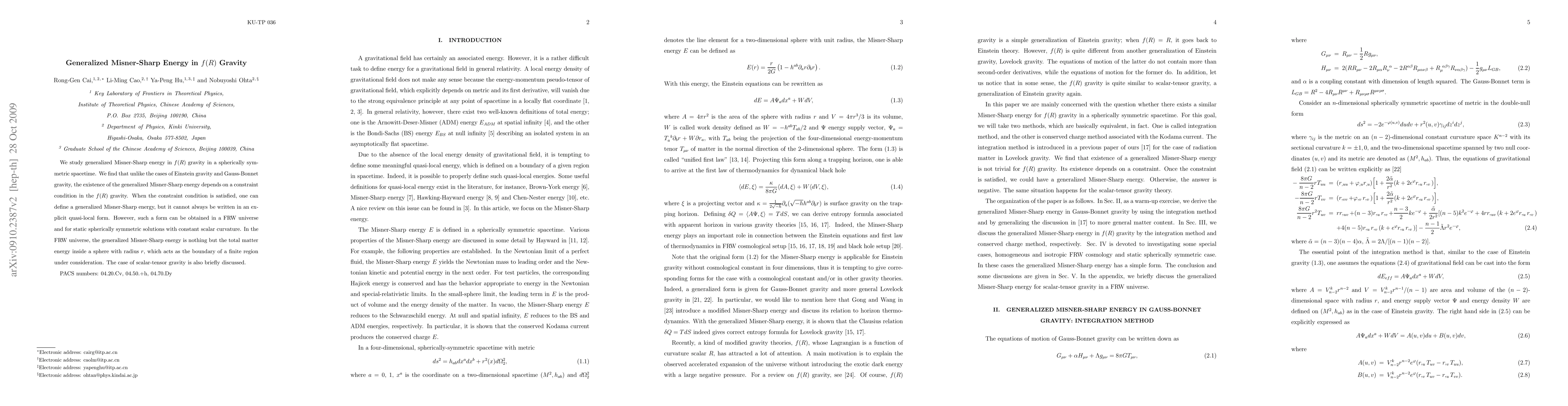 The generalized Misner-Sharp energy in f(R) gravity depends on a constraint condition, and its quasi-local form can only be obtained for specific types of solutions, such as FRW universes and static spherically symmetric spacetimes with constant scalar curvature.