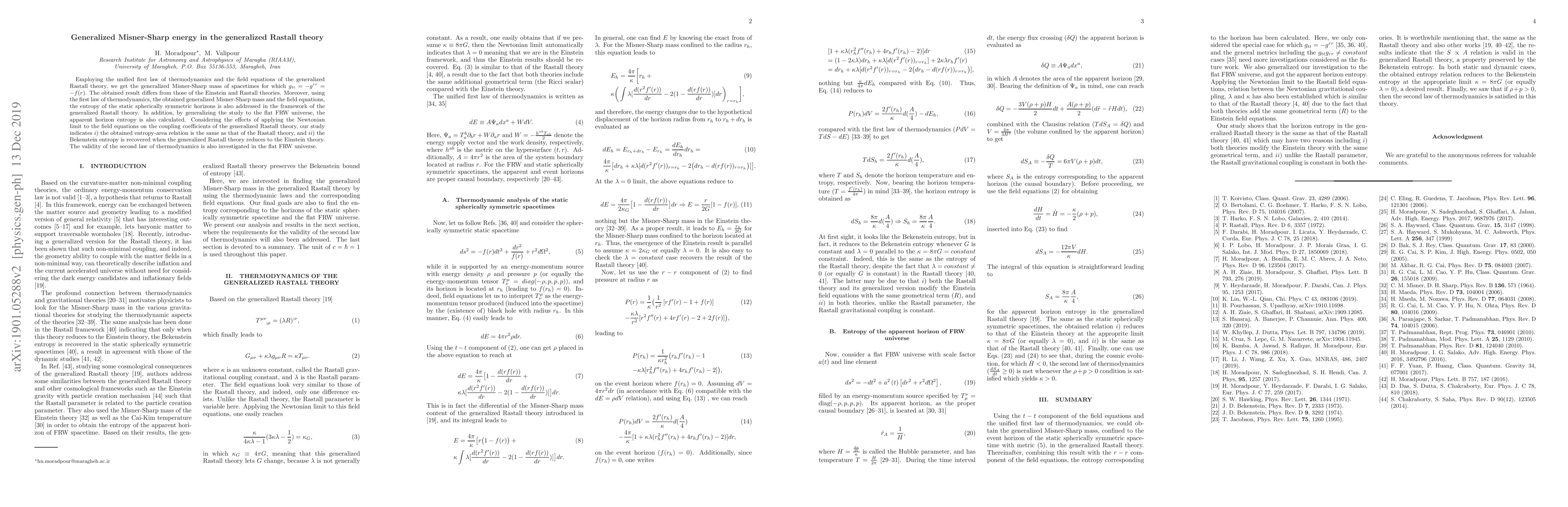 This paper derives the generalized Misner-Sharp mass in the context of the generalized Rastall theory, finding differences from Einstein and Rastall theories. It also calculates the entropy of static spherically symmetric horizons and the apparent horizon entropy in a flat FRW universe, showing consistency with the Rastall theory and recovery of Bekenstein entropy in the Newtonian limit.