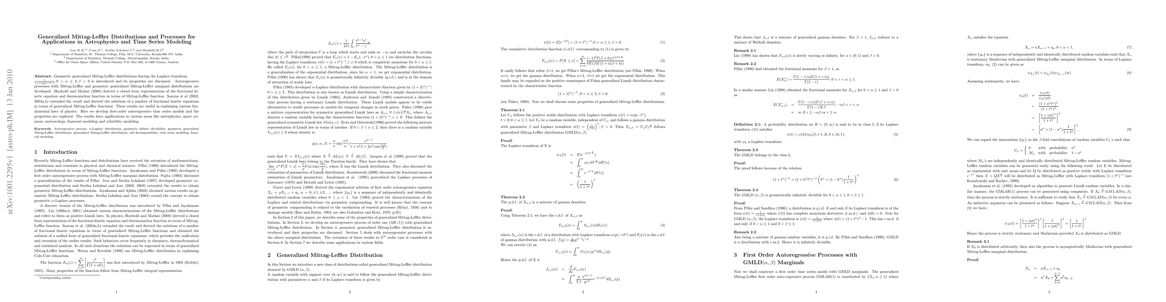 This paper introduces geometric generalized Mittag-Leffler distributions and develops autoregressive processes with these distributions. The findings have broad applications in astrophysics, time series modeling, and other fields due to their utility in explaining fundamental physical laws.
