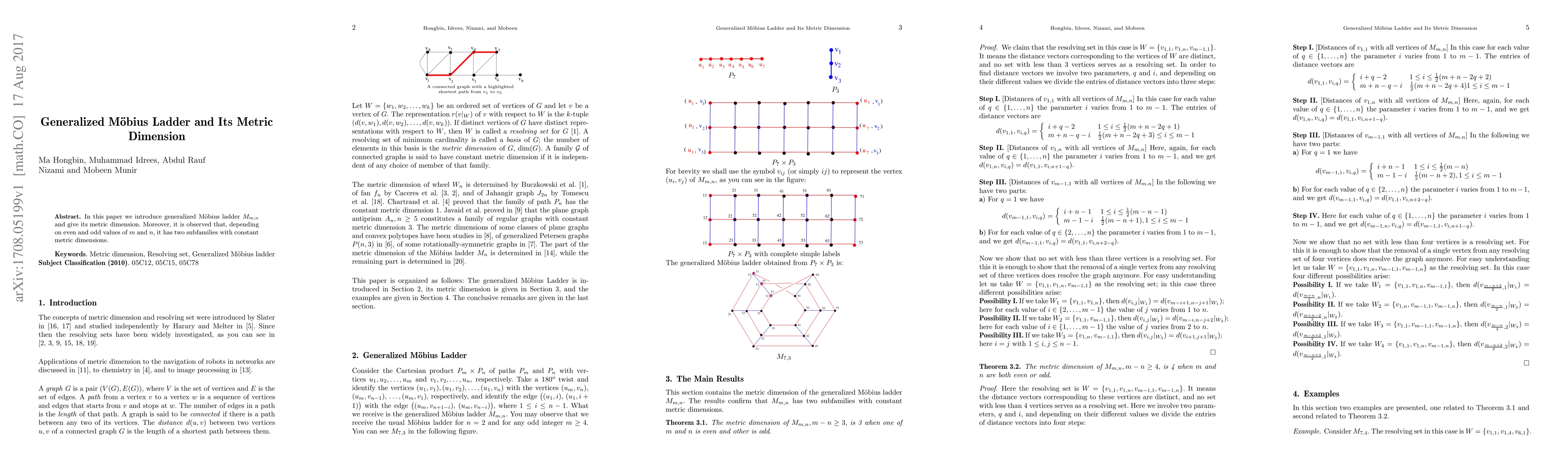 This paper introduces generalized M"{o}bius ladders with varying metric dimensions depending on m and n values, discovering two subfamilies with constant metric dimensions.