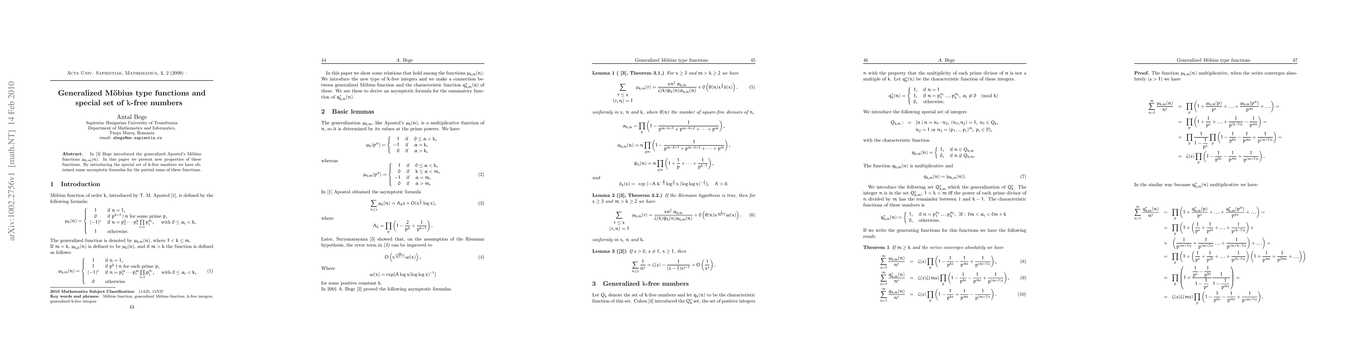 This paper introduces new properties of generalized Mobius-type functions and provides asymptotic formulas for partial sums using a special set of k-free numbers.